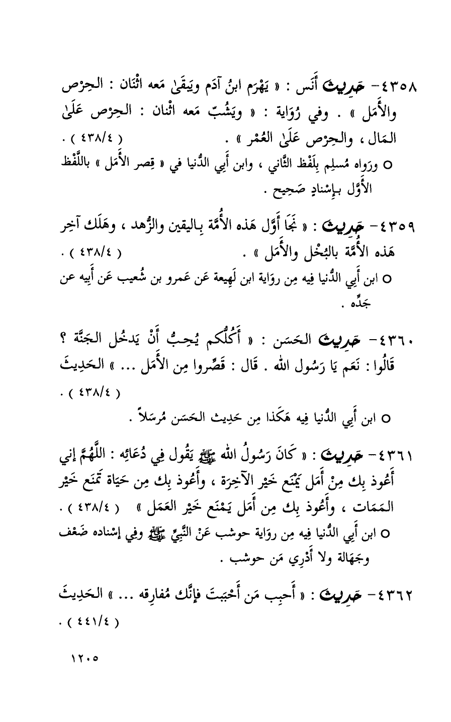4358 حديث أنس ( يهرم ابن آدم ويبقى معه اثنان الحرص والأمل وفي رواية ( ويشب معه اثنان الحرص على المال والحرص على العمر ) ( 4 / 438 ) (1)