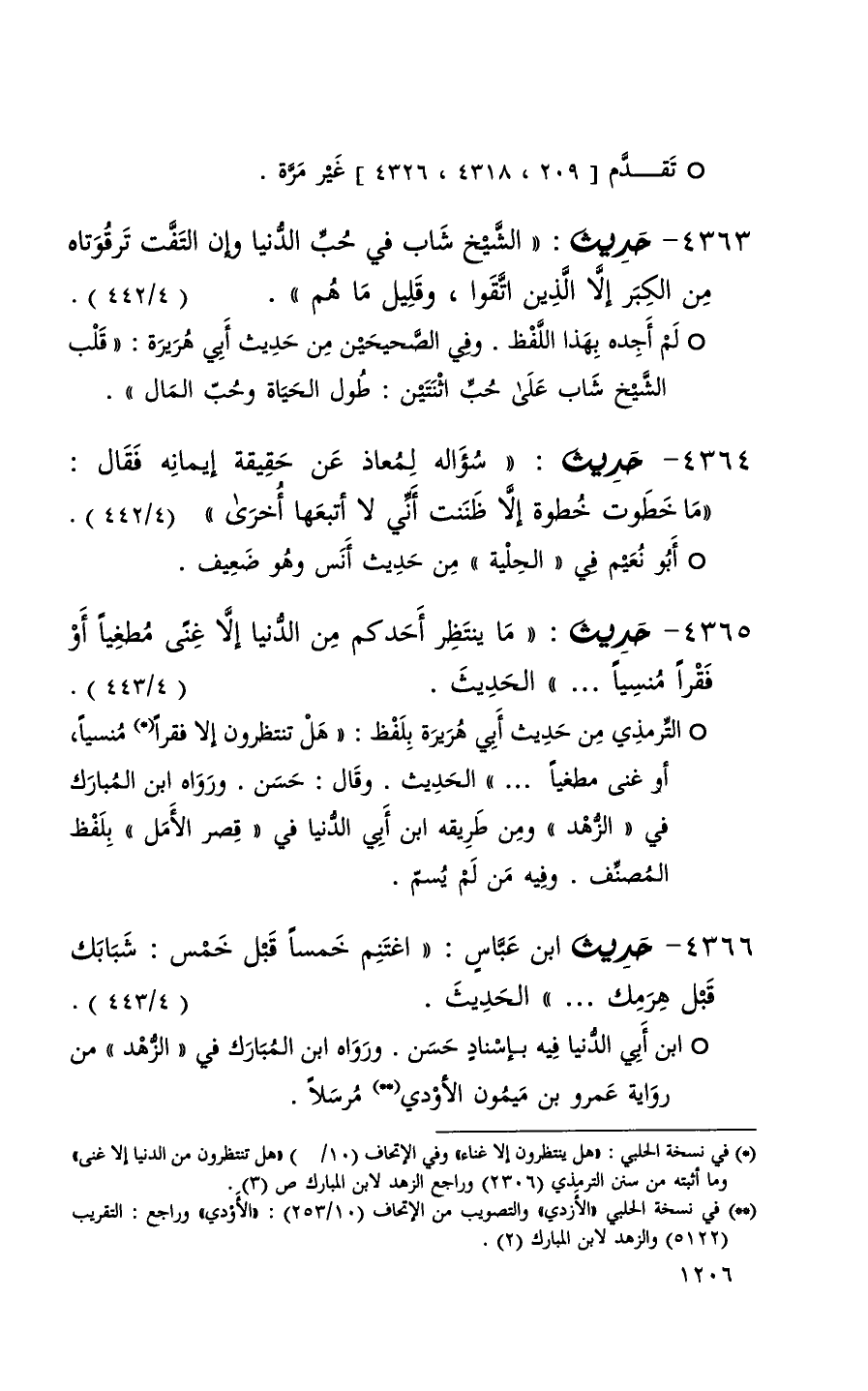 4363 حديث ( الشيخ شاب فيحب الدنيا وإن التفت ترقوتاه من الكبر إلا الذين اتقوا وقليل ما هم ) ( 4 / 442 ) + لم أجده بهذا اللفظ وفي الصحيحين من حديث أبي هريرة ( قلب الشيخ شاب على حب اثنتين طول الحياة وحب المال ) +