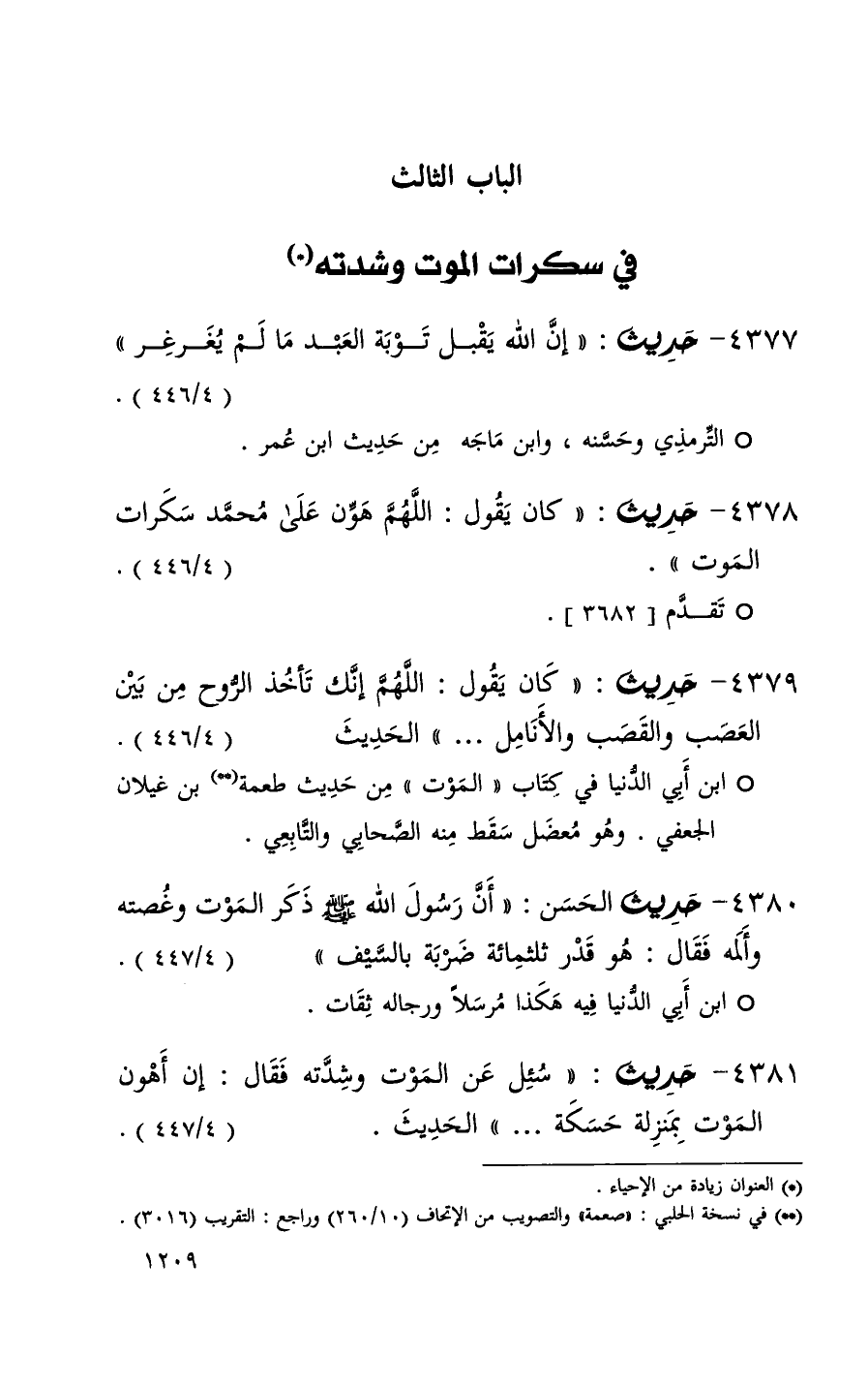 4381 حديث ( سئل عن الموت وشدته فقال إن أهون الموت بمنزلة حسكة . . . ) الحديث ( 4 / 447 )