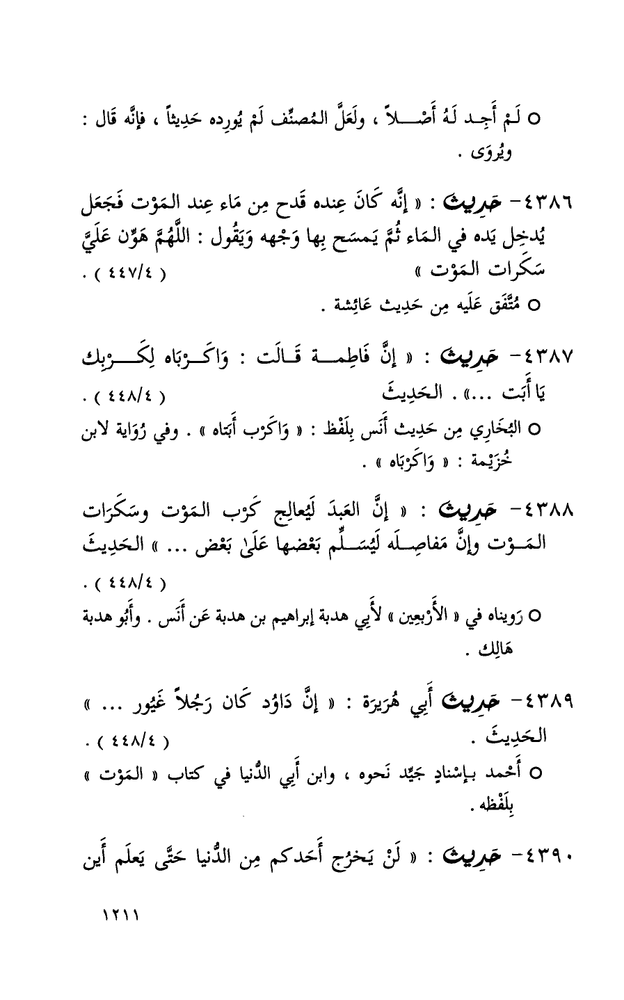 4388 حديث ( إن العبد ليعالج كرب الموت وسكرات الموت وإن مفاصله ليسلم بعضها على بعض . . . ) الحديث ( 4 / 448 ) + رويناه في الأربعين لأبي هدبة إبراهيم بن هدبة عن أنس وأبو هدبة هالك +