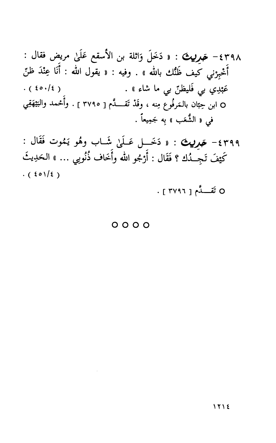 4398 حديث ( دخل واثلة بن الأسقع على مريض فقال أخبرني كيف ظنك بالله ) وفيه ( يقول الله أنا عند ظن عبدي بي فليظن بي ما شاء ) ( 4 / 450 ) (1)