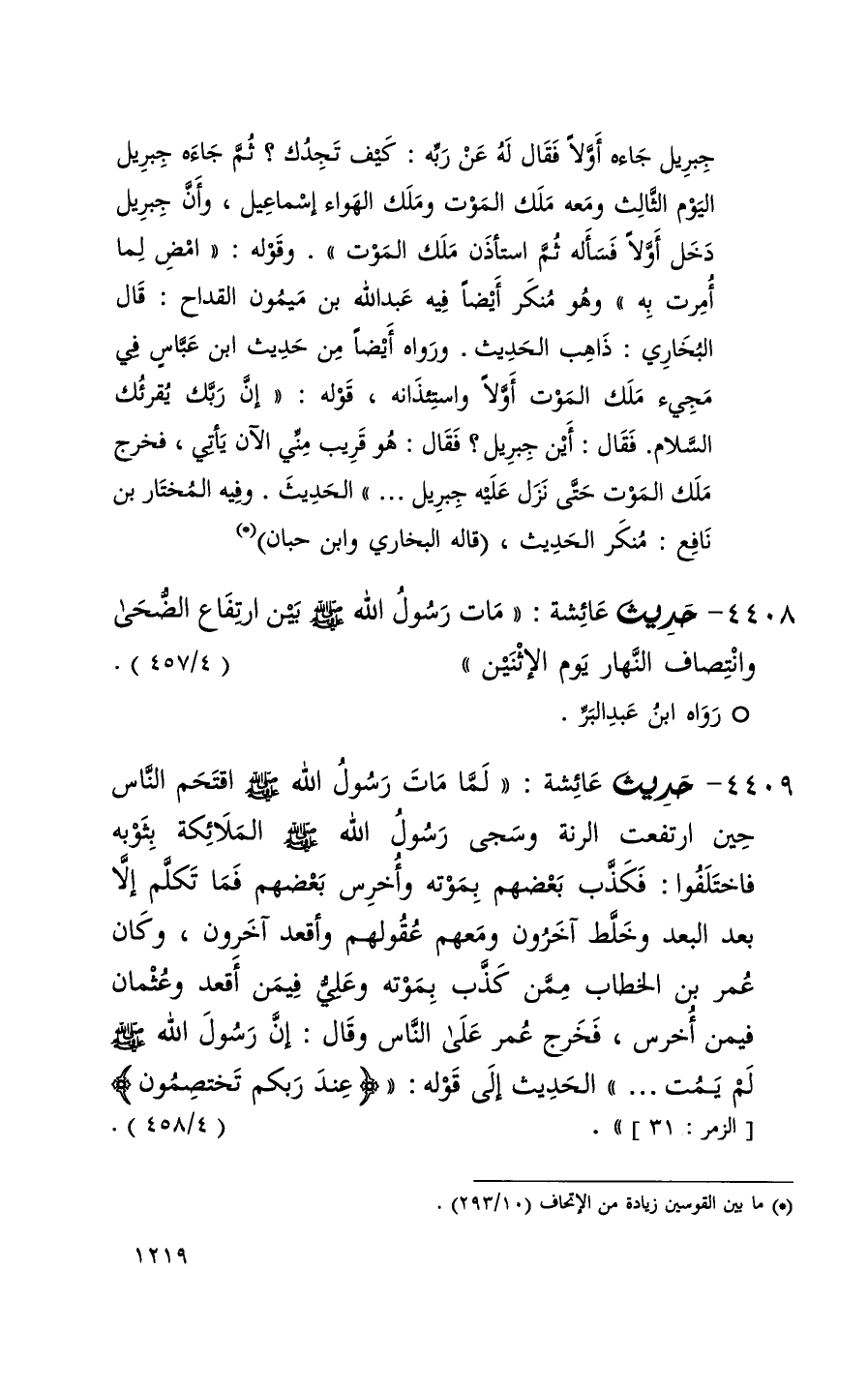 4408 حديث عائشة ( مات رسول الله بين ارتفاع الضحى وانتصاف النهار يوم الإثنين ) ( 4 / 457 )