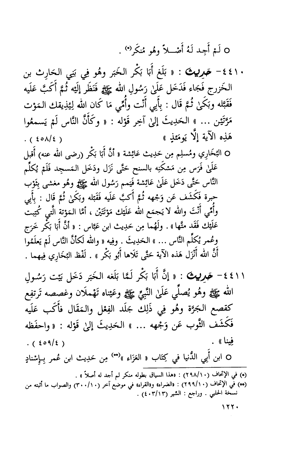 4410 حديث ( بلغ أبا بكر الخبر وهو في بني الحارث بن الخزرج فجاء فدخل على رسول الله فنظر إليه ثم أكب عليه فقبله وبكى ثم قال بأبي أنت وأمي ما كان الله ليذيقك الموت مرتين 000 ) الحديث إلى آخره قوله ( وكأن الناس لم يسمعوا هذه الآية إلا يومئذ ) ( 4 / 458 ) + البخاري ومسلم من حديث عائشة ( أن أبا بكر رضي الله عنه أقبل على فرس من مسكنه بالسنح حتى نزل ودخل المسجد فلم يكلم الناس حتى دخل على عائشة فيمم رسول الله وهو مغشى بثوب حبرة فكشف عن وجهه ثم أكب عليه فقبله وبكى ثم قال بأبي وأمي أنت والله لا يجمع الله عليك موتتين أما الموتة التي كتبت عليك فقد متها ) ولهما من حديث ابن عباس ( أن أبا بكر خرج وعمر يكلم الناس 000 ) الحديث وفيه ( والله لكأن الناس لم يعلموا أن الله أنزل هذه الآية حتى تلاها أبو بكر ) لفظ البخاري فيهما +