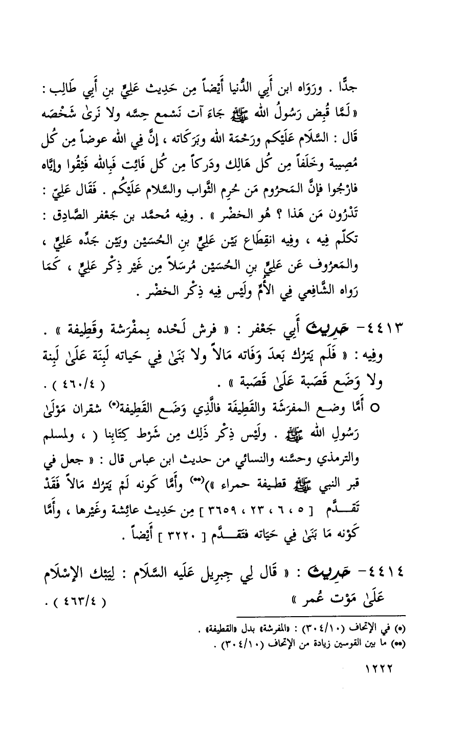 4413 حديث أبي جعفر ( فرش لحده بمفرشة وقطيفة ) وفيه ( فلم يترك بعد وفاته مالاً ولا بنى في حياته لبنة على لبنة ولا وضع قصبة على قصبة ) ( 4 / 460 )