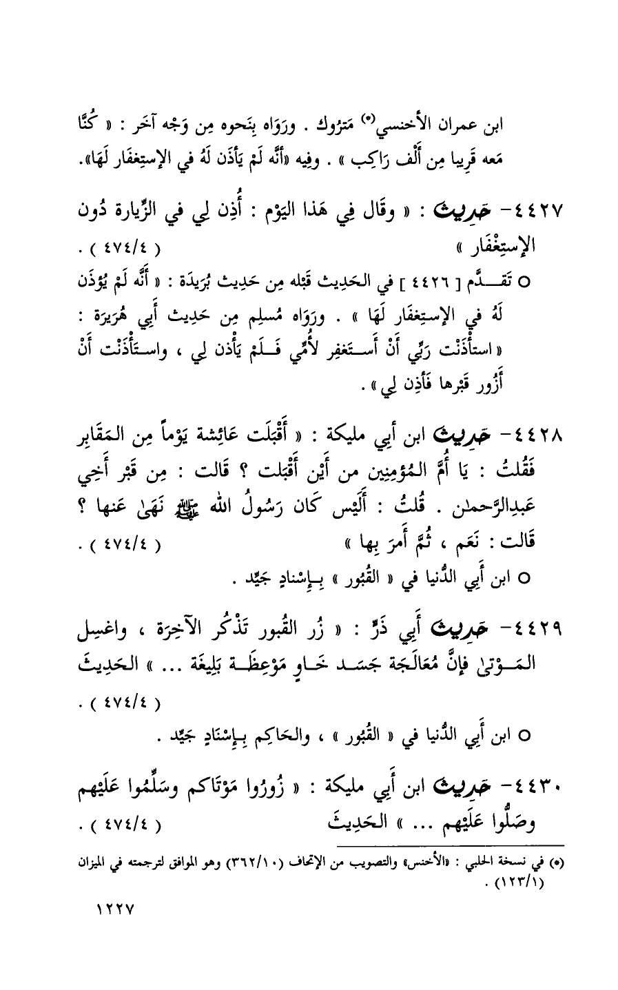 4430 حديث ابن أبي مليكة ( زوروا موتاكم وسلموا عليهم وصلوا عليهم 000 ) الحديث ( 4 / 474 )