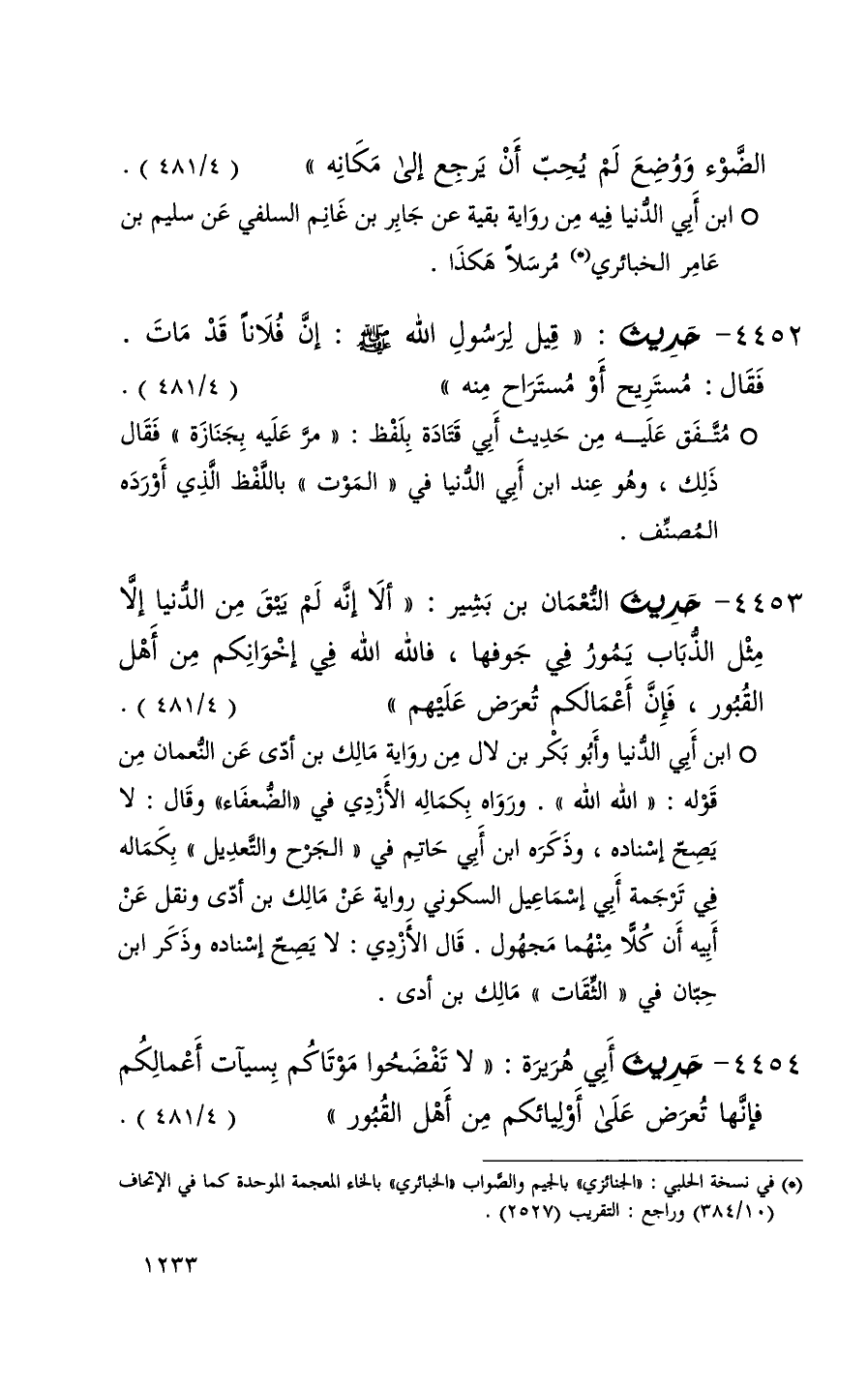4454 حديث أبي هريرة ( لا تفضحوا موتاكم بسيآت أعمالكم فإنها تعرض على أوليائكم من أهل القبور ) ( 4 / 481 )