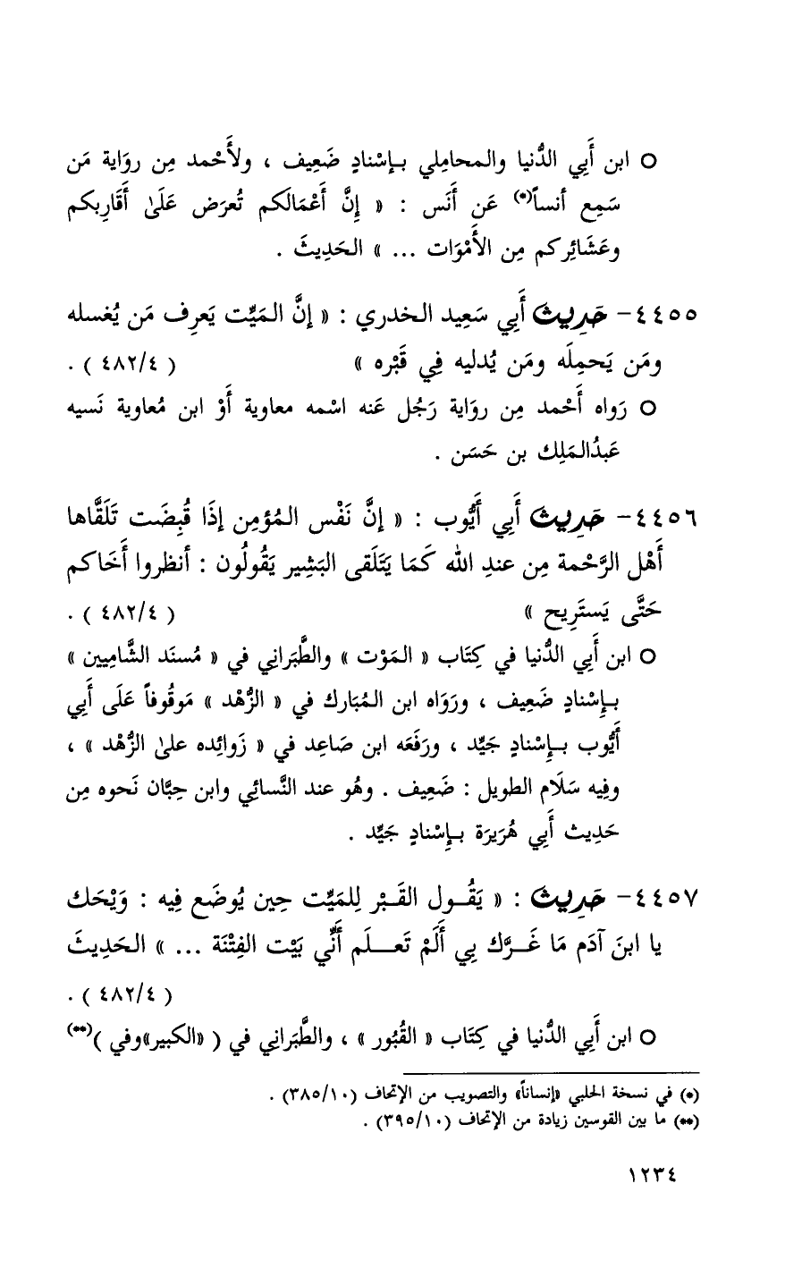 4456 حديث أبي أيوب ( إن نفس المؤمن إذا قبضت تلقاها أهل الرحمة من عند الله كما يتلقى البشير يقولون أنظروا أخاكم حتى يستريح ) ( 4 / 482 ) + ابن أبي الدنيا في كتاب الموت والطبراني في مسند الشاميين بإسناد ضعيف ورواه ابن المبارك في الزهد موقوفاً على أبي أيوب بإسناد جيد ورفعه ابن صاعد في زوائده على الزهد وفيه سلام الطويل ضعيف وهو عند النسائي وابن حبان نحوه من حديث أبي هريرة بإسناد جيد +