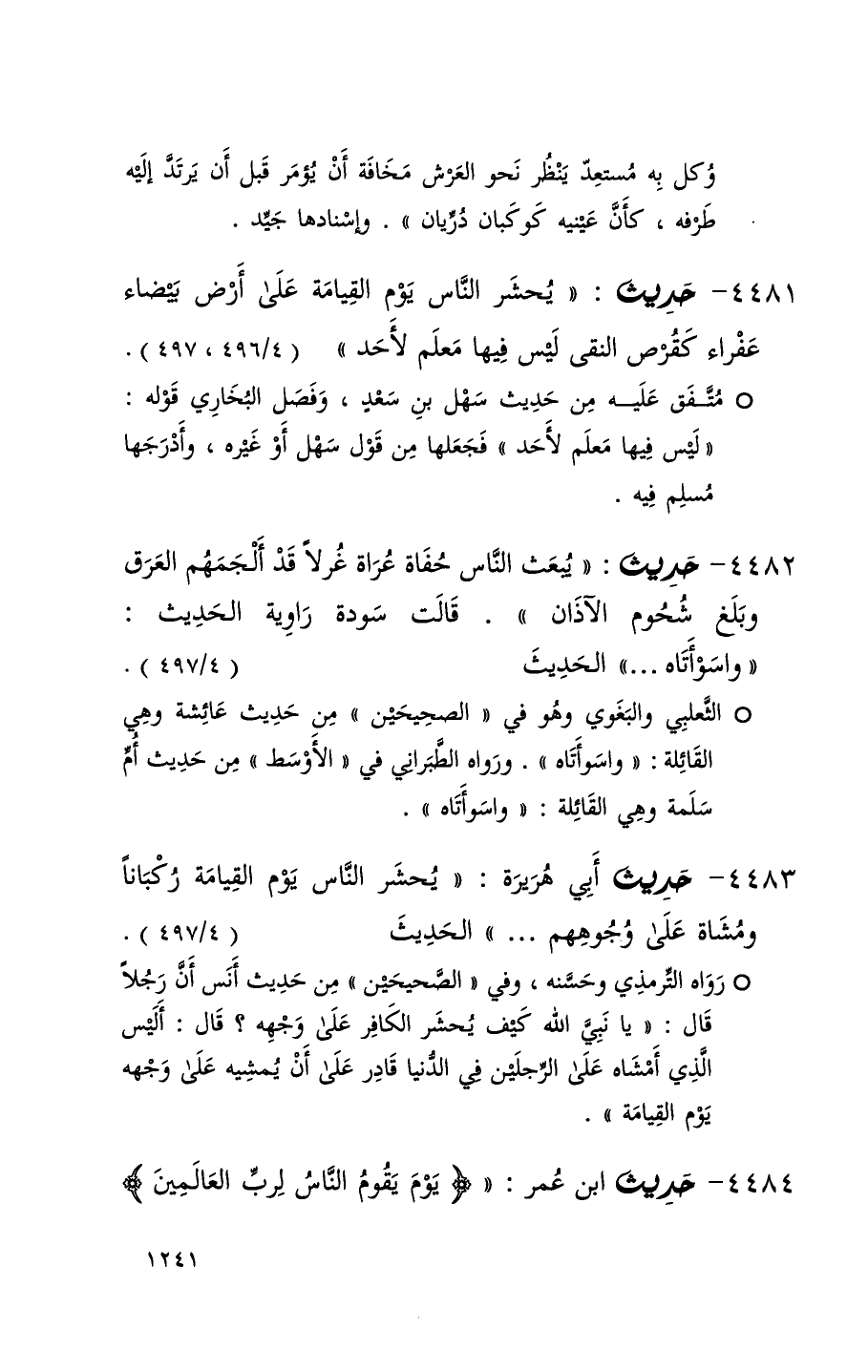 4481 حديث ( يحشر الناس يوم القيامة على أرض بيضاء عفراء كقرص النقى ليس فيها معلم لأحد ) ( 4 / 496ِ 497 )