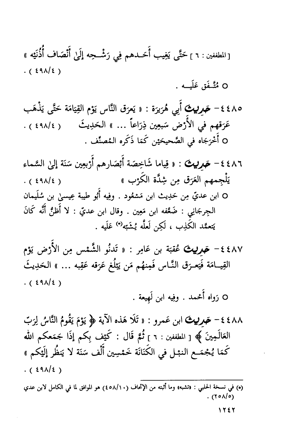 4485 حديث أبي هريرة ( يعرق الناس يوم القيامة حتى يذهب عرقهم في الأرض سبعين ذراعاً 000 ) الحديث ( 4 / 498 ) + أخرجاه في الصحيحين كما ذكره المصنف +