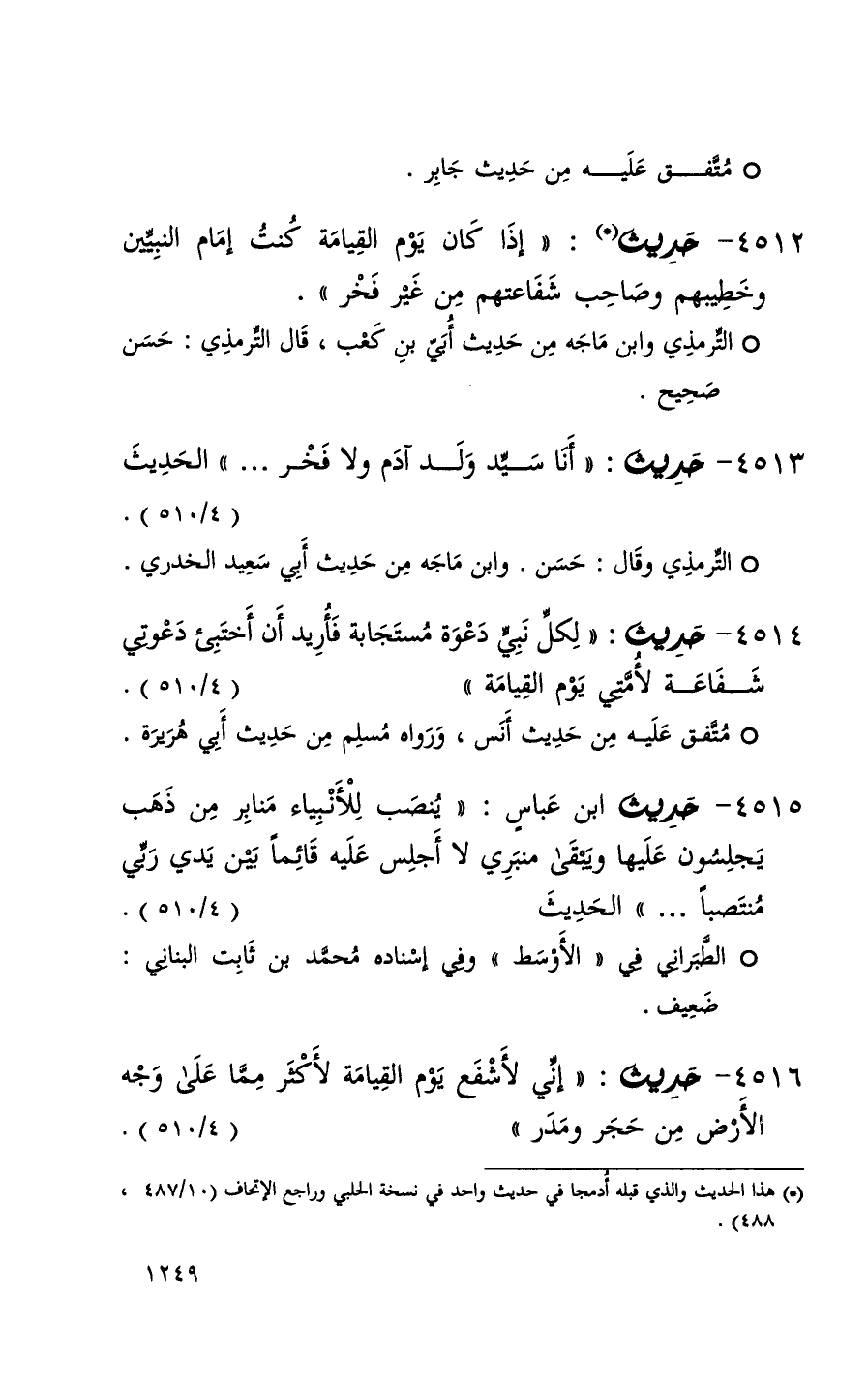 4512 حديث ( إذا كان يوم القيامة كنت إمام النبيين وخطيبهم وصاحب شفاعتهم من غير فخر ) + الترمذي وابن ماجه من حديث أبي بن كعب قال الترمذي حسن صحيح +