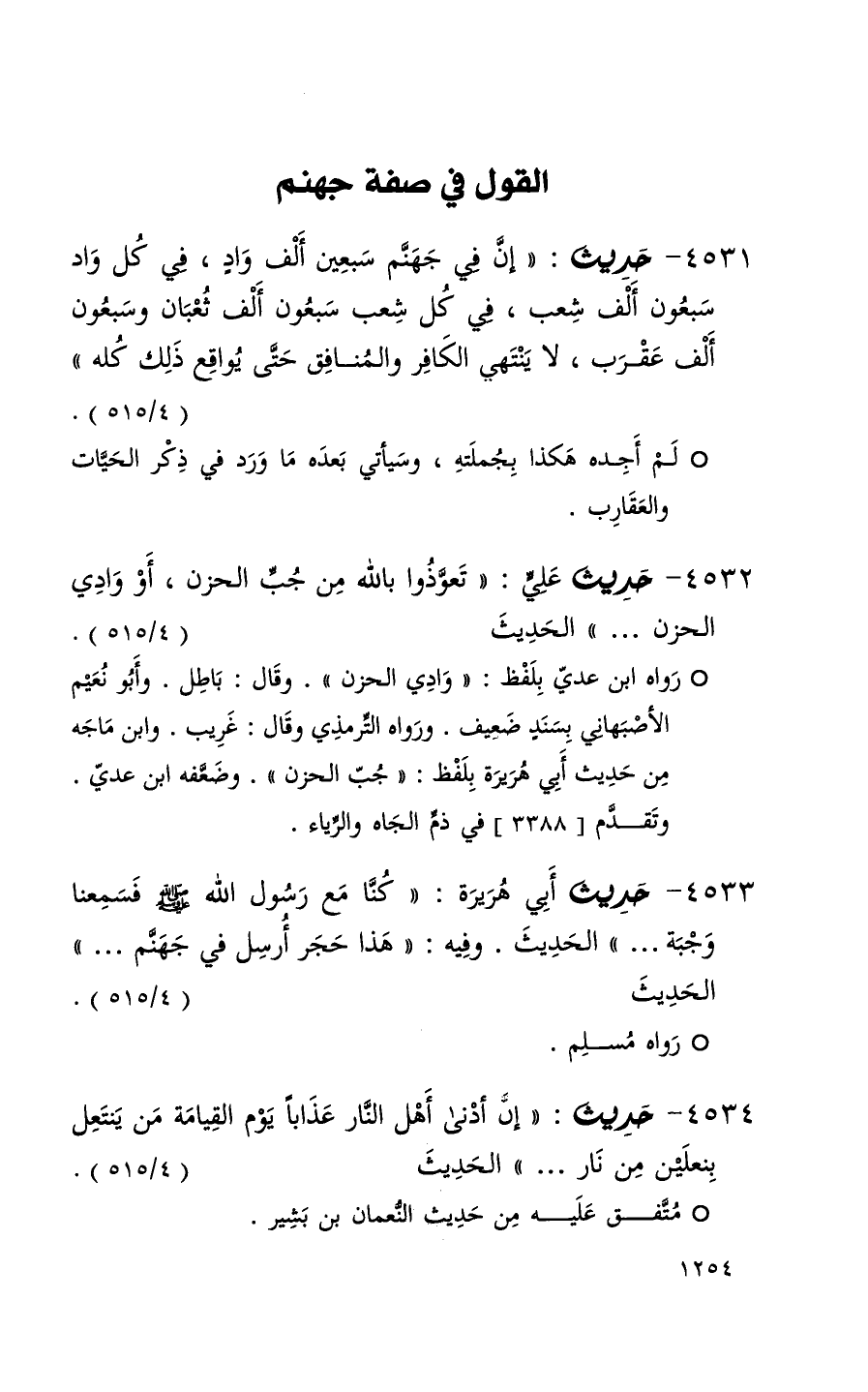 4531 حديث ( إن في جهنم سبعين ألف واد في كل واد سبعون ألف شعب في كل شعب سبعون ألف ثعبان وسبعون ألف عقرب لا ينتهي الكافر والمنافق حتى يواقع ذلك كله ) (1)