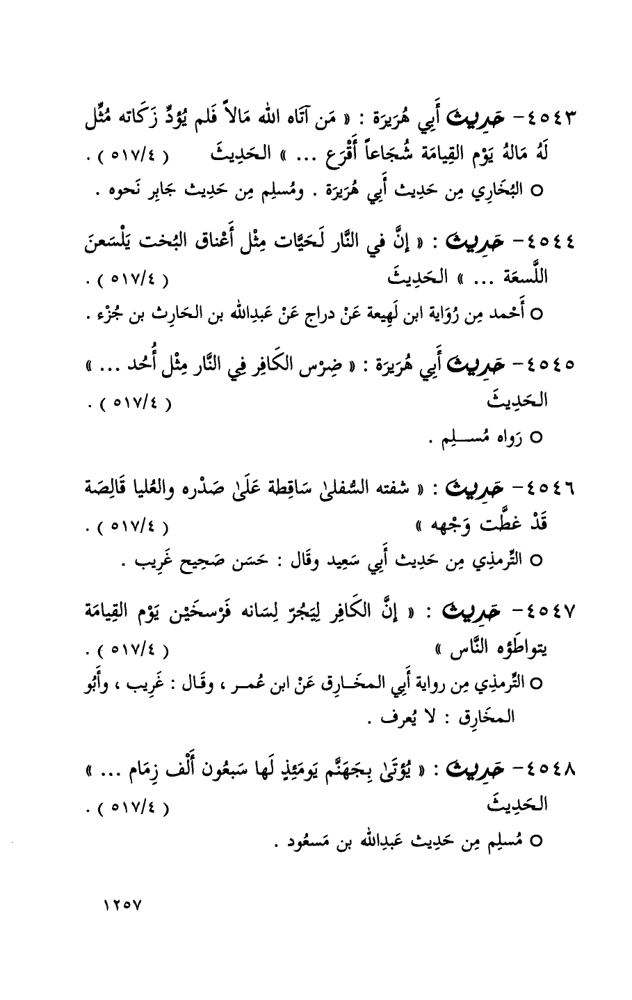 4543 حديث أبي هريرة ( من آتاه الله مالاً فلم يؤد زكاته مثل له ماله يوم القيامة شجاعاً أقرع . . . ) الحديث ( 4 / 517 ) (1)