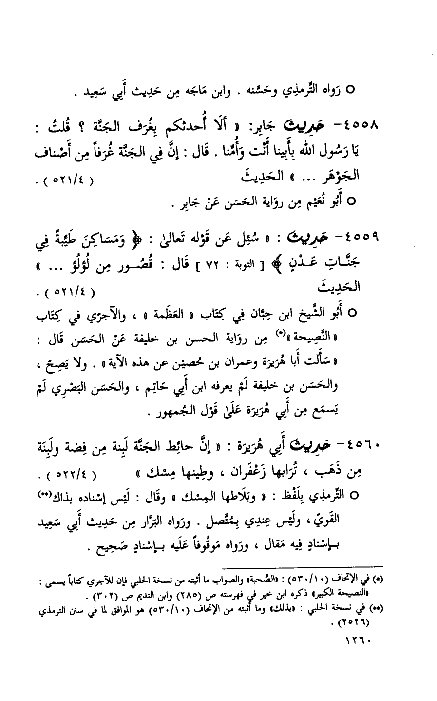 4559 حديث ( سئل عن قوله تعالى ( ^ ومساكن طيبة في جنات عدن ) التوبة 72 قال قصور من لؤلؤ . . . ) الحديث ( 4 / 521 ) + أبو الشيخ ابن حبان في كتاب العظمة والآجري في كتاب النصيحة من رواية الحسن بن خليفة عن الحسن قال ( سألت أبا هريرة وعمران بن حصين عن هذه الآية ) ولا يصح والحسن بن خليفة لم يعرفه ابن أبي حاتم والحسن البصري لم يسمع من أبي هريرة على قول الجمهور +