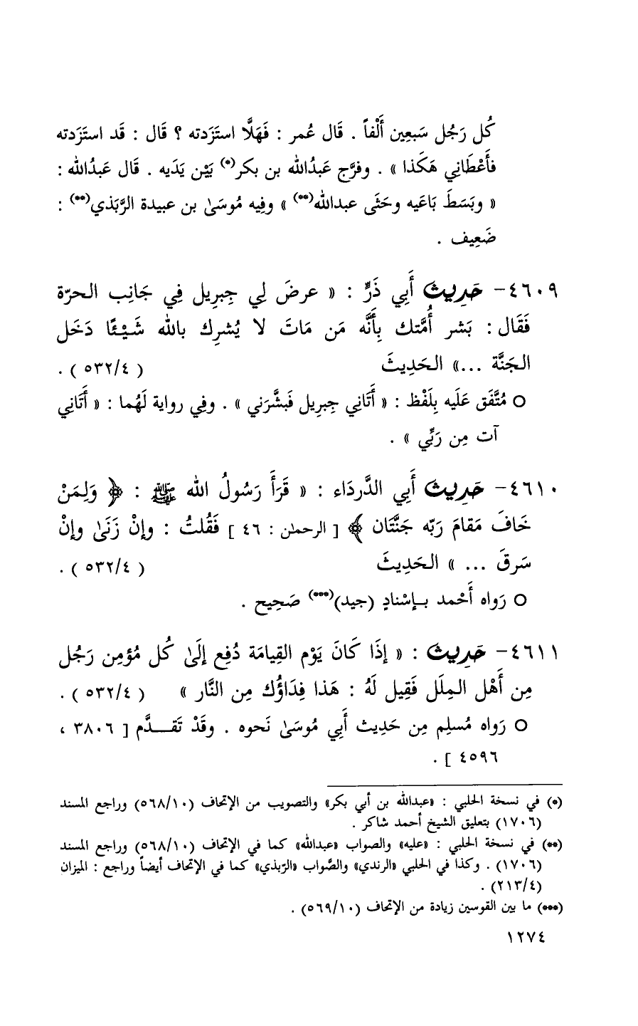 4609 حديث أبي ذر ( عرض لي جبريل في جانب الحرة فقال بشر أمتك بأنه من ما لا يشرك بالله شيئاً دخل الجنة . . . ) الحديث ( 4 / 532 )