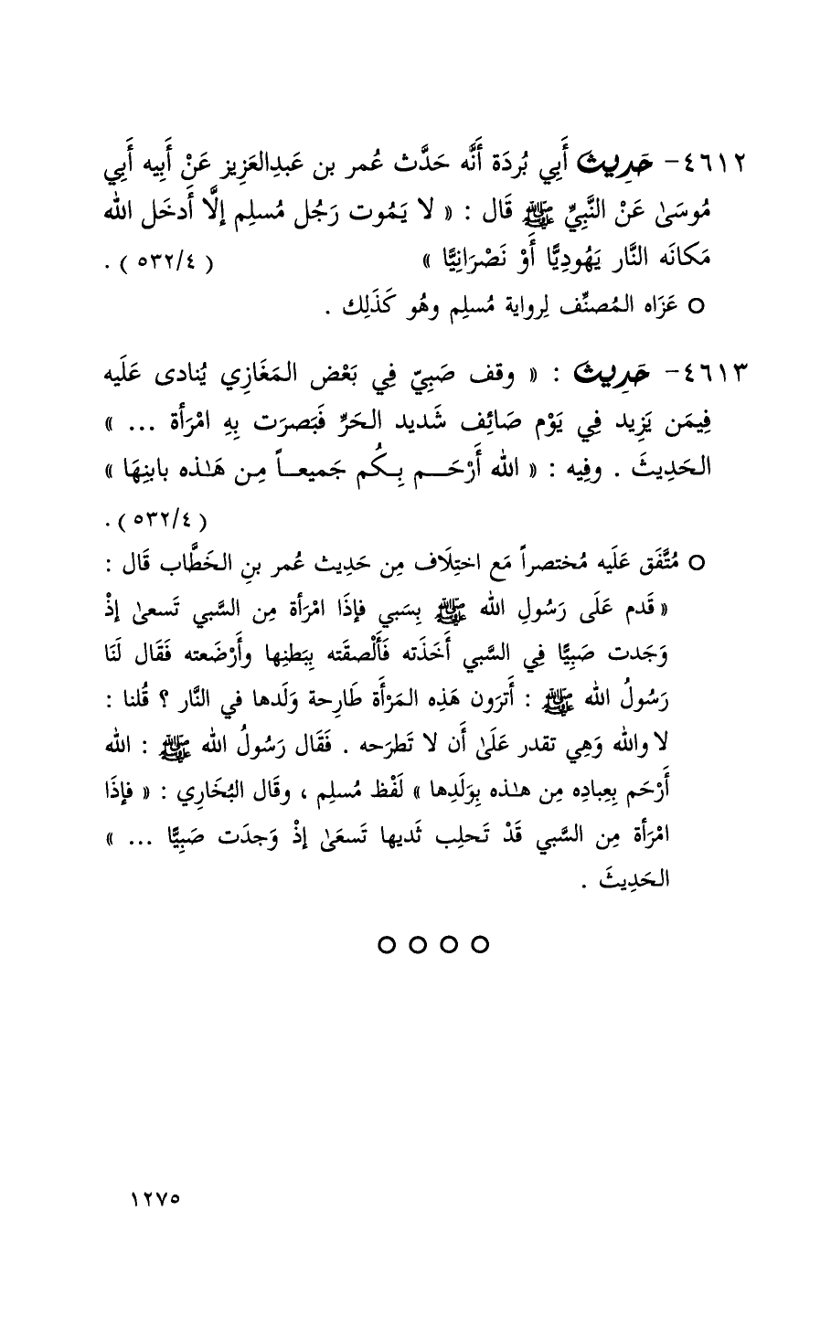4613 حديث ( وقف صبي في بعض المغازي ينادى عليه فيمن يزيد في يوم صائف شديد الحر فبصرت به امرأة . . . ) الحديث وفيه ( الله أرحم بكم جميعاً من هذه بابنها ) ( 4 / 532 ) + متفق عليه من حديث عمر بن الخطاب قال ( قدم على رسول الله بسبي فإذا امرأة من السبي تسعى إذ وجدت صبياً في السبي أخذته فألصقته ببطنها وأرضعته فقال لنا رسول الله أترون هذه المرأة طارحة ولدها في النار قلنا لا والله وهي تقدر على أن لا تطرحه فقال رسول الله الله أرحم بعباده من هذه بولدها ) لفظ مسلم وقال البخاري ( فإذا امرأة من السبي قد تحلب ثديها تسعى إذ وجدت صبياً . . . ) الحديث +