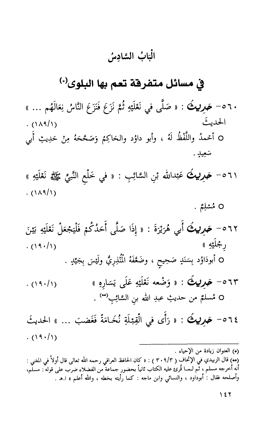 560 حديث ( صلى في نعليه ثم نزع فنزع الناس نعالهم . . . ) الحديث ( 1 / 189 ) (1)