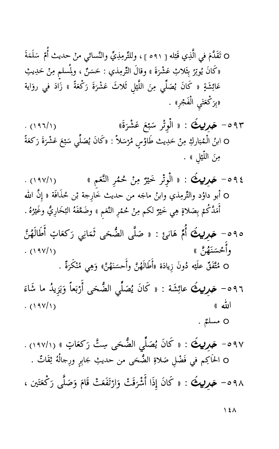 594 حديث ( الوتر خير من حمر النعم ) ( 1 / 197 ) + أبو داود والترمذي وابن ماجه من حديث خارجة بن حذفة ( إن الله أمدكم بصلاة هي خير لكم من حمر النعم ) وضعفه البخاري وغيره +