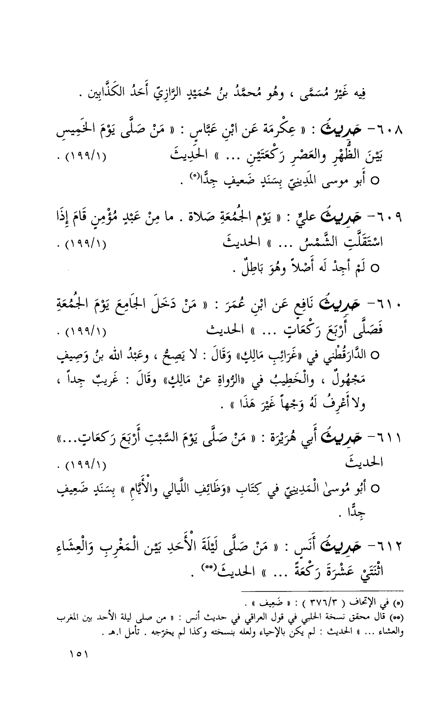 609 حديث علي ( يوم الجمعة صلاة ما من عبد مؤمن قام إذا استقلت الشمس . . . ) الحديث ( 1 / 199 ) + لم أجد له أصلاً وهو باطل +