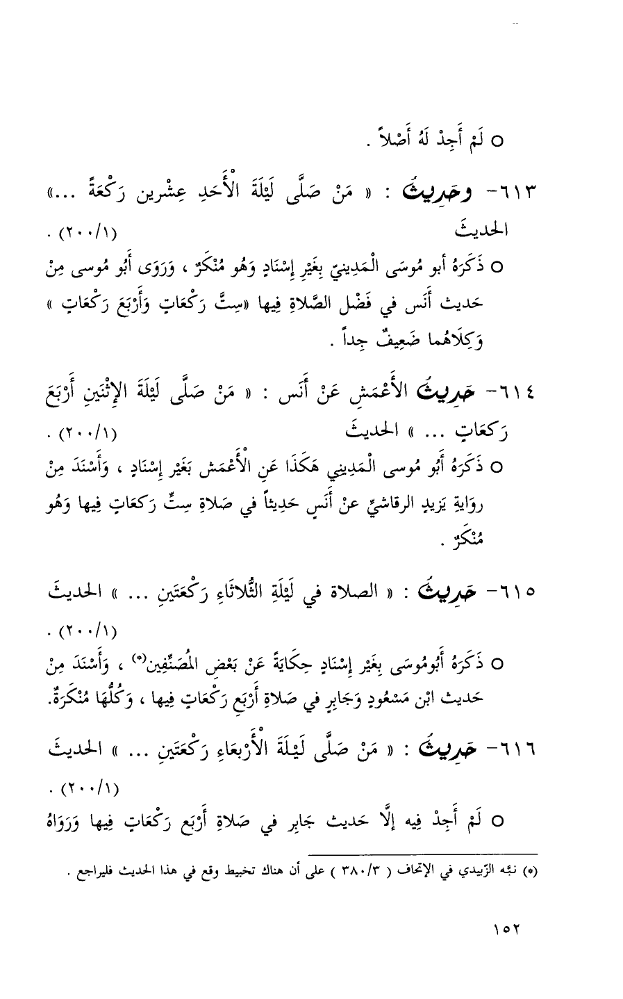 614 حديث الأعمش عن أنس ( من صلى ليلة الاثنين أربع ركعات . . . ) الحديث ( 1 / 200 ) + ذكره أبو موسى المديني هكذا عن الأعمش بغير إسناد وأسند من رواية يزيد الرقاشي عن أنس حديثاً في صلاة ست ركعات فيها وهو منكر +