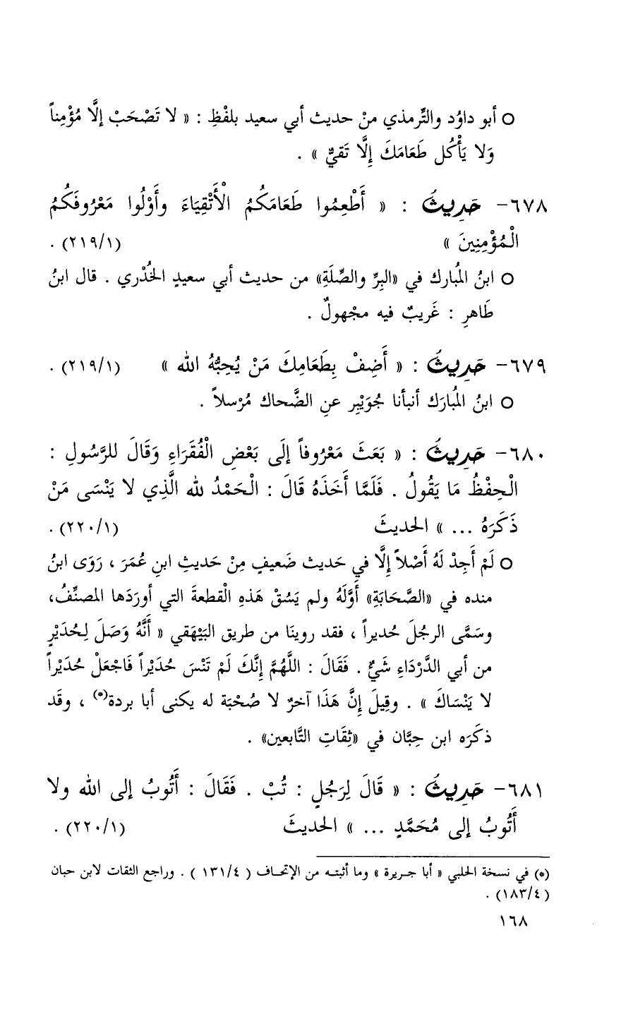 678 حديث ( أطعموا طعامكم الأتقياء وأولوا معروفكم المؤمنين ) ( 1 / 219 ) + ابن المبارك في البر والصلة من حديث أبي سعيد الخدري قال ابن طاهر غريب فيه مجهول +