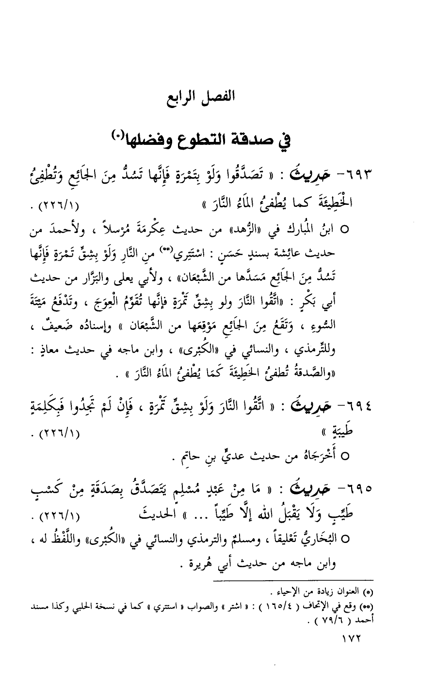 693 حديث ( تصدقوا ولو بتمرة فإنها تسد من الجائع وتطفئ الخطيئة كما يطفئ الماء النار ) ( 1 / 226 ) (1)