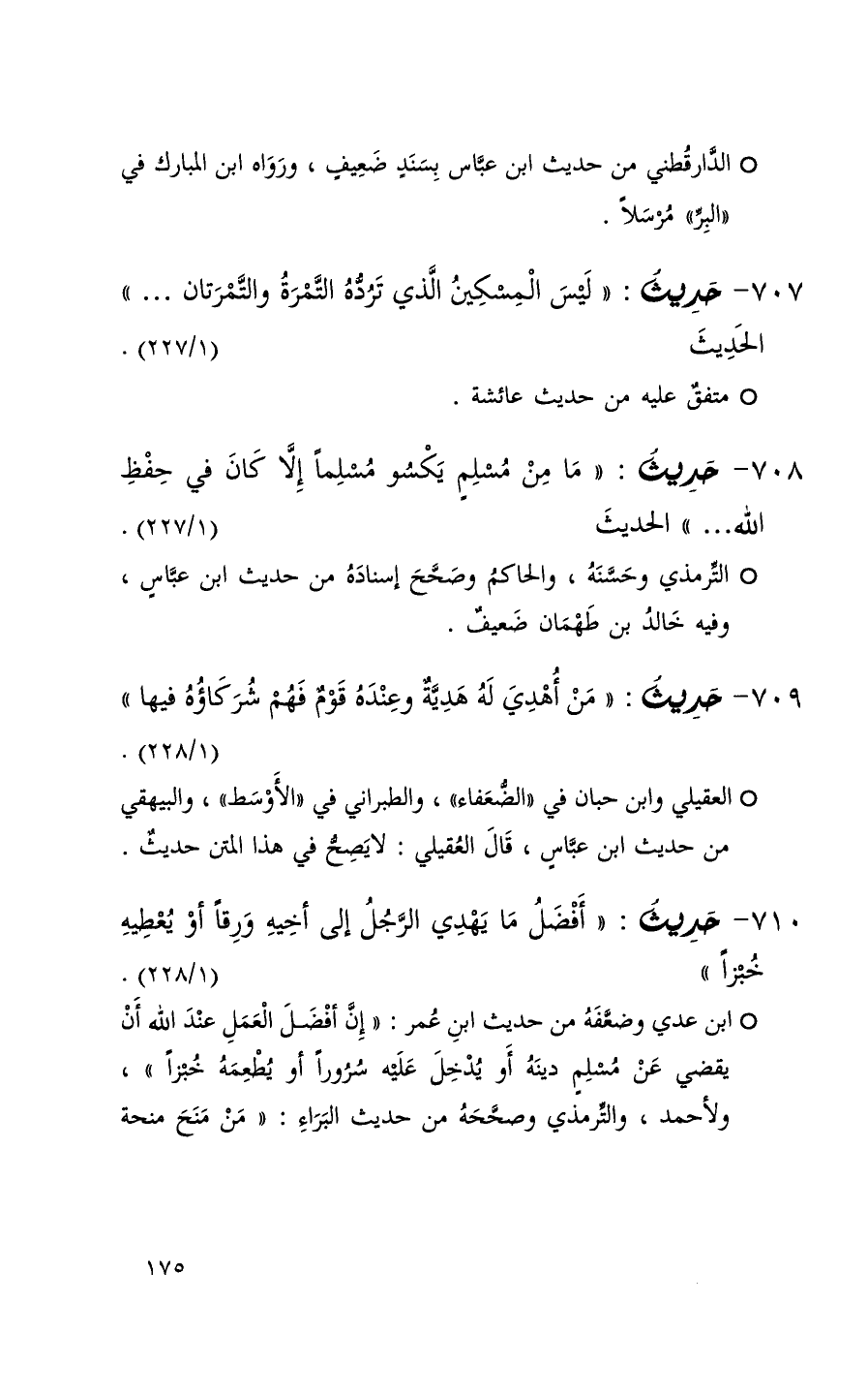 710 حديث ( أفضل ما يهدي الرجل إلى أخيه ورقاً أو يعطيه خبزا ' ( 1 / 228 ) . + ابن عدي وضعفه من حديث ابن عمر : ' أن أفضل العمل عند الله أن يقضي عن مسلم دينة أو يدخل عليه سروراً أو طعمه خبزاً ) ولأحمد والترمذي وصححه من حديث البراء ( من منح منحة