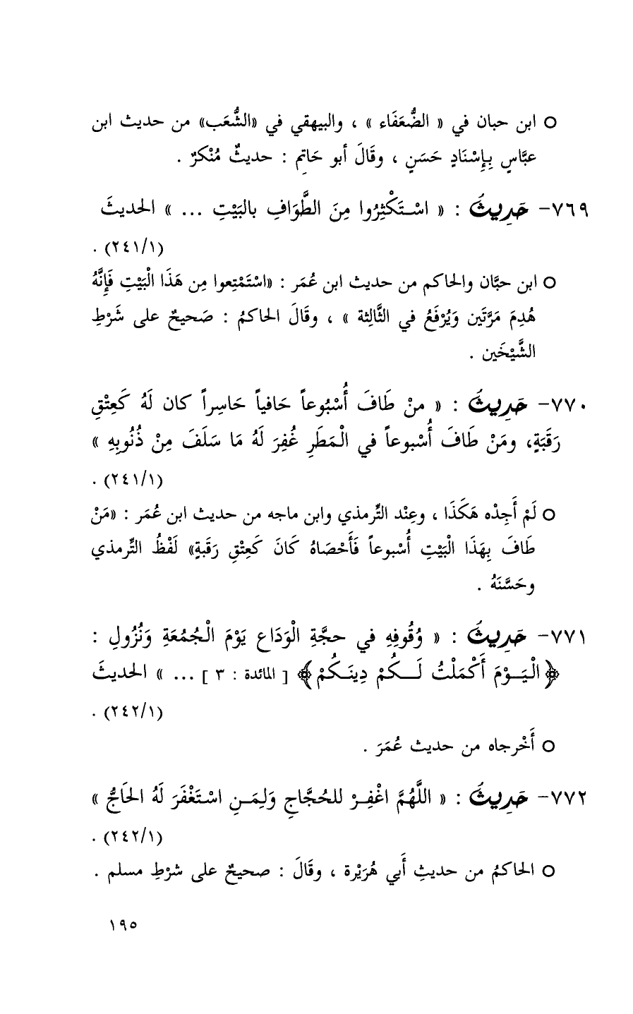 770 حديث ( من طاف أسبوعاً حافياً حاسراً كان له كعتق رقبة ومن طاف أسبوعاً في المطر غفر له ما سلف من ذنوبه ) ( 1 / 241 ) + لم أجده هكذا وعند الترمذي وابن ماجه من حديث ابن عمر ( من طاف بهذا البيت أسبوعاً فأحصاه كان كعتق رقبة ) لفظ الترمذي وحسنه +