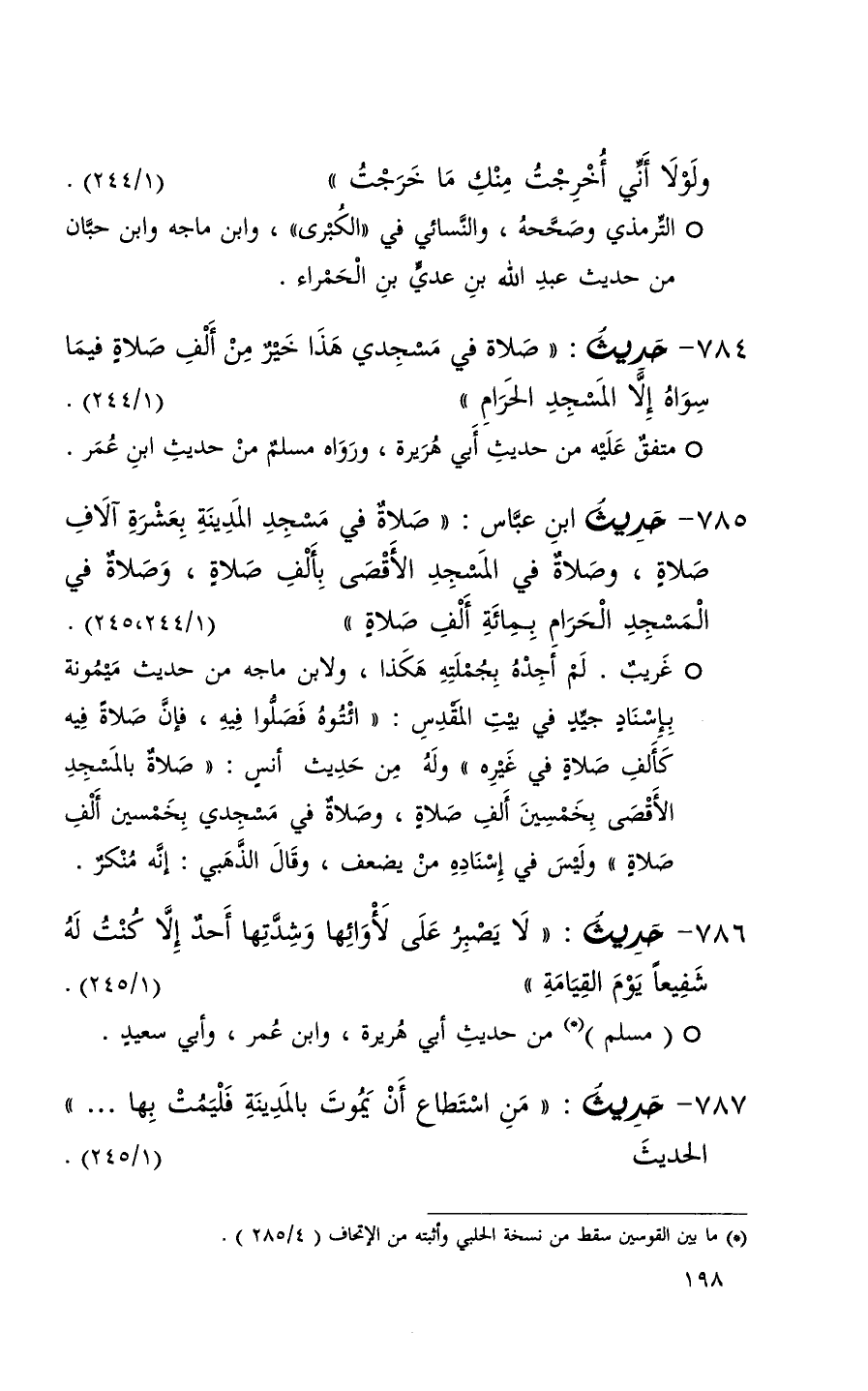 785 حديث ابن عباس ( صلاة في مسجد المدينة بعشرة آلاف صلاة وصلاة في المسجد الأقصى بألف صلاة وصلاة في المسجد الحرام بمائة ألف صلاة ) ( 1 / 244 / 245 ) + غريب لم أجده بجملته هكذا ولابن ماجه من حديث ميمونة بإسناد جيد في بيت المقدس ( ائتوه فصلوا فيه فإن صلاة فيه كألف صلاة في غيره ) وله من حديث أنس ( صلاة بالمسجد الأقصى بخمسين ألف صلاة وصلاة في مسجدي بخمسين ألف صلاة ) وليس في إسناده من يضعف وقال الذهبي إنه منكر +