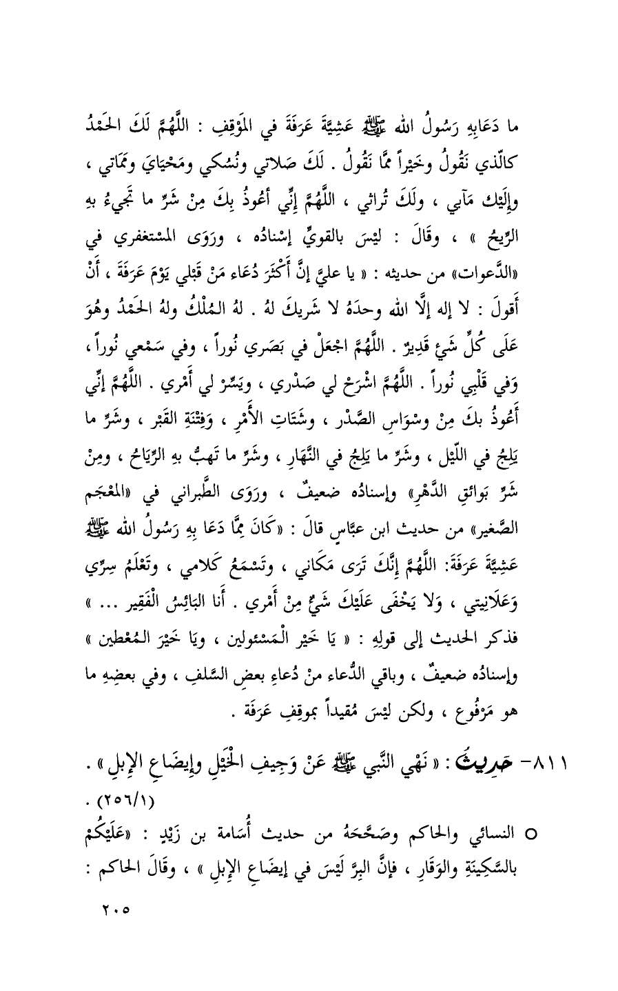 ما دعا به رسول الله عشية عرفة في الموقف اللهم لك الحمد كالذي نقول وخيراً مما نقول لك صلاتي ونسكي ومحياي ومماتي وإليك مآبي ولك تراثي اللهم إني أعوذ بك من شر ما تجيء به الريح ) وقال ليس بالقوي إسناده وروى المستغفري في الدعوات من حديثه ( يا علي إن أكثر دعاء من قبلي يوم عرفة أن أقول لا إله إلا الله وحده لا شريك له له الملك وله الحمد وهو على كل شيء قدير اللهم اجعل في بصري نوراً وفي سمعي نوراً وفي قلبي نوراً اللهم اشرح لي صدري ويسر لي أمري اللهم إني أعوذ بك من وسواس الصدر وشتات الأمر وفتنة القبر وشر ما يلج في الليل وشر ما يلج في النهار وشر ما تهب به الرياح ومن شر بوائق الدهر ) وإسناده ضعيف وروى الطبراني في المعجم الصغير من حديث ابن عباس قال ( كان مما دعا به رسول الله عشية عرفة اللهم إنك ترى مكاني وتسمع كلامي وتعلم سري وعلانيتي ولا يخف عليك شيء من أمري أنا البائس الفقير . . . ) فذكر الحديث إلى قوله ( يا خير المسئولين ويا خير المعطين ) وإسناده ضعيف وباقي الدعاء من دعاء بعض السلف وفي بعضه ما هو مرفوع ولكن ليس مقيداً بموقف عرفة (1) النسائي والحاكم وصححه من حديث أسامة بن زيد ( عليكم بالسكينة والوقار فإن البر ليس في إيضاع الإبل ) وقال الحاكم