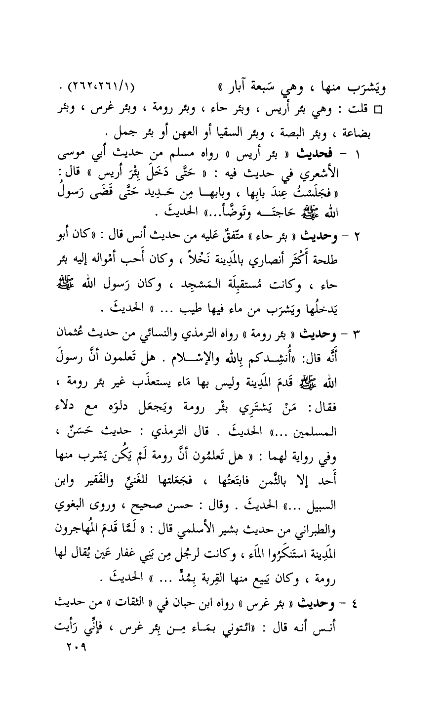 ويشرب منها وهي سبعة آبار ) ( 1 / 261 / 262 ) قلت وهي بئر أريس وبئر حاء وبئر رومة وبئر غرس وبئر بضاعة وبئر البصة وبئر السقيا أو العهن أو بئر جمل