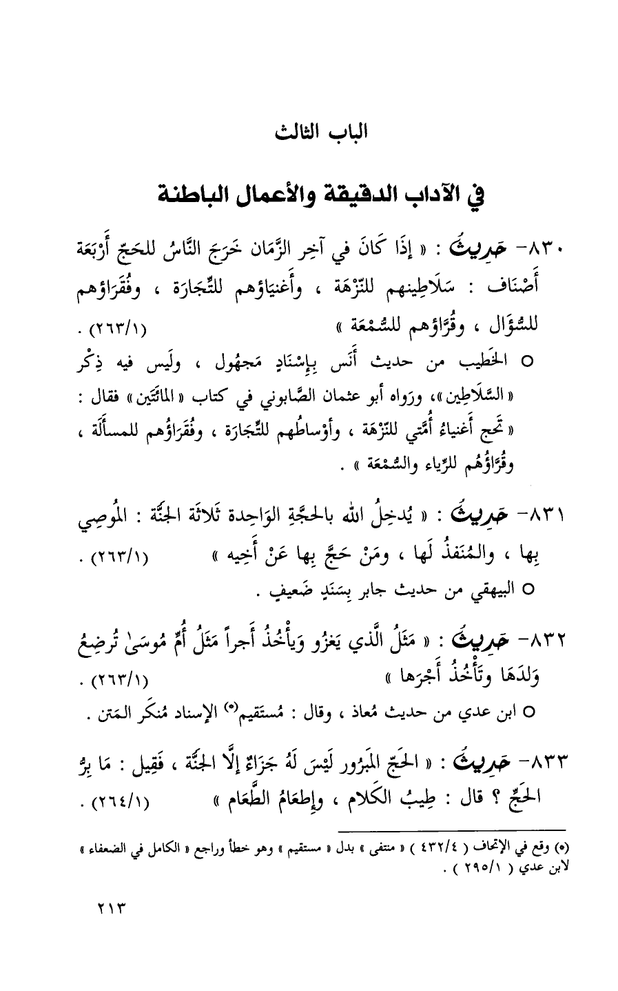 830 حديث ( إذا كان في آخر الزمان خرج الناس للحج أربعة أصناف سلاطينهم للنزهة وأإنياؤهم للتجارة وفقراؤهم للسؤال وقراؤهم للسمعة ) ( 1 / 263 ) (1)