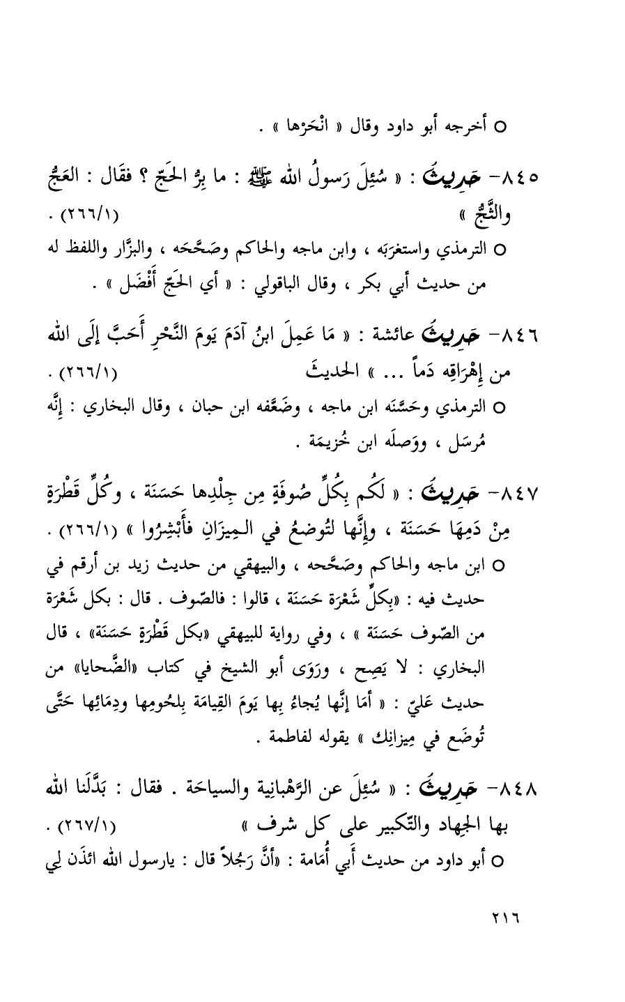 846 حديث عائشة ( ما عمل ابن آدم يوم النحر أحب إلى الله من إهراقه دماً 000 ) الحديث ( 1 / 226 ) + الترمذي وحسنه ابن ماجه وضعفه ابن حبان وقال البخاري إنه مرسل ووصله ابن خزيمة +
