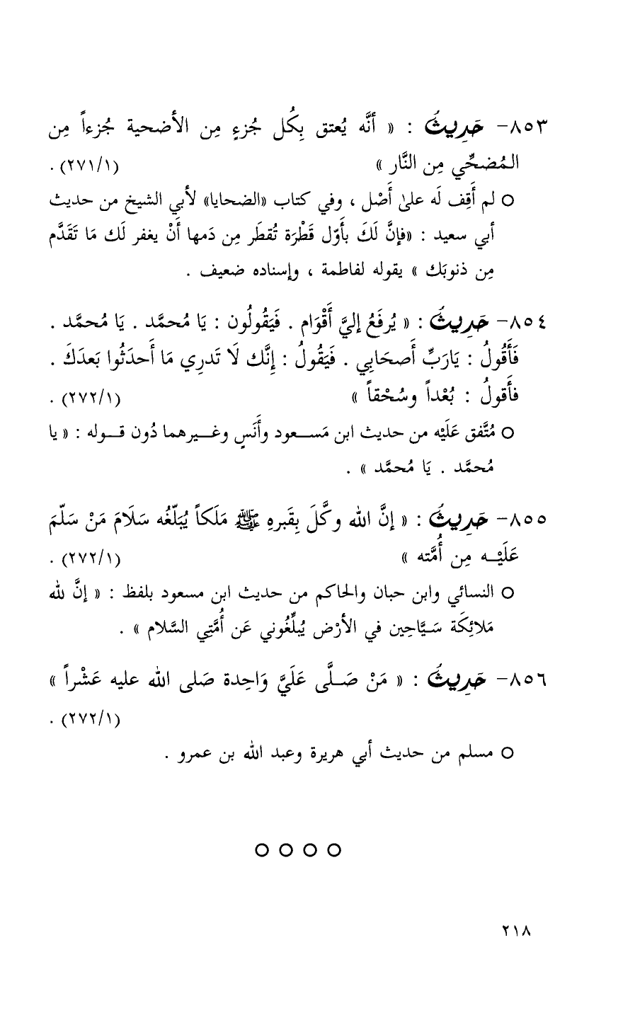 855 حديث ( إن الله وكل بقبره ملكاً يبلغه سلام من سلم عليه من أمته ) ( 1 / 272 ) + النسائي وابن حبان والحاكم من حديث ابن مسعود بلفظ ( إن لله ملائكة سياحين في الأرض يبلغوني عن أمتي السلام ) +