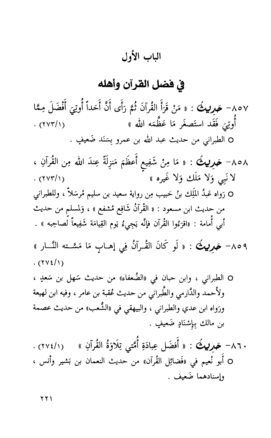 857 حديث ( من قرأ القرآن ثم رأى أن أحداً أوتي أفضل مما أوتي فقد استصغر ما عظمه الله ) ( 1 / 273 ) (1)