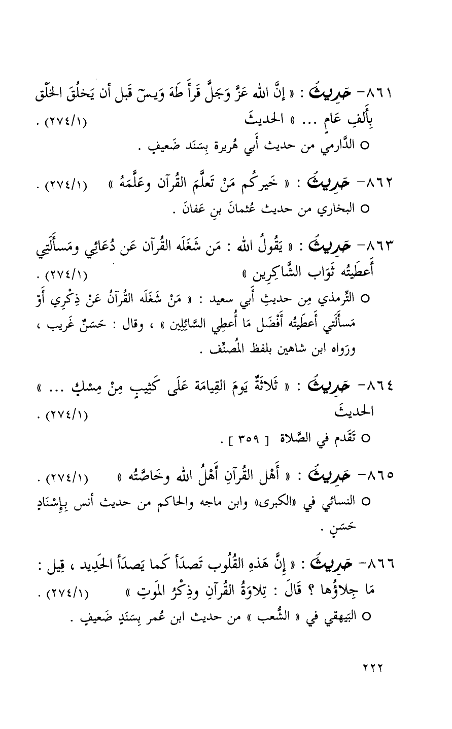 861 حديث ( إن الله عز وجل قرأ طه ويس قبل أن يخلق الخلق بألف عام . . . ) الحديث ( 1 / 274 ) (1)