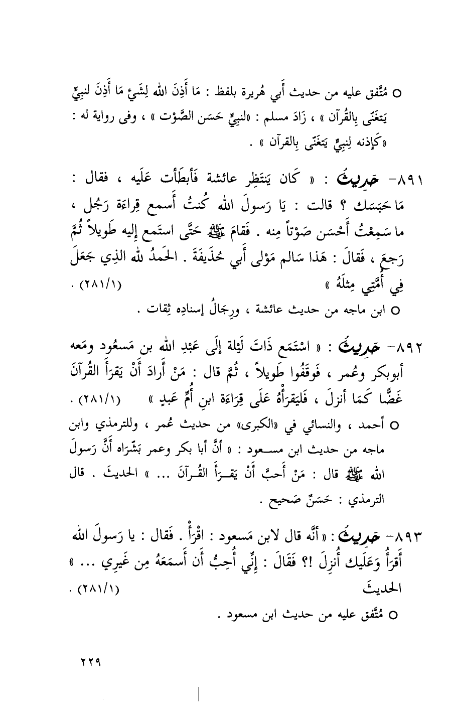 892 حديث ( استمع ذات ليلة إلى عبد الله بن مسعود ومعه أبو بكر وعمر فوقفوا طويلاً ثم قال من أراد أن يقرأ القرآن غضاً كما أنزل فليقرأه على قراءة ابن أم عبد + ( 1 / 281 ) + أحمد والنسائي في الكبرى من حديث عمر وللترمذي وابن ماجه من حديث ابن مسعود ( أن أبا بكر وعمر بشراه أن رسول الله قال من أحب أن يقرأ القرآن . . . ) الحديث قال الترمذي حسن صحيح +