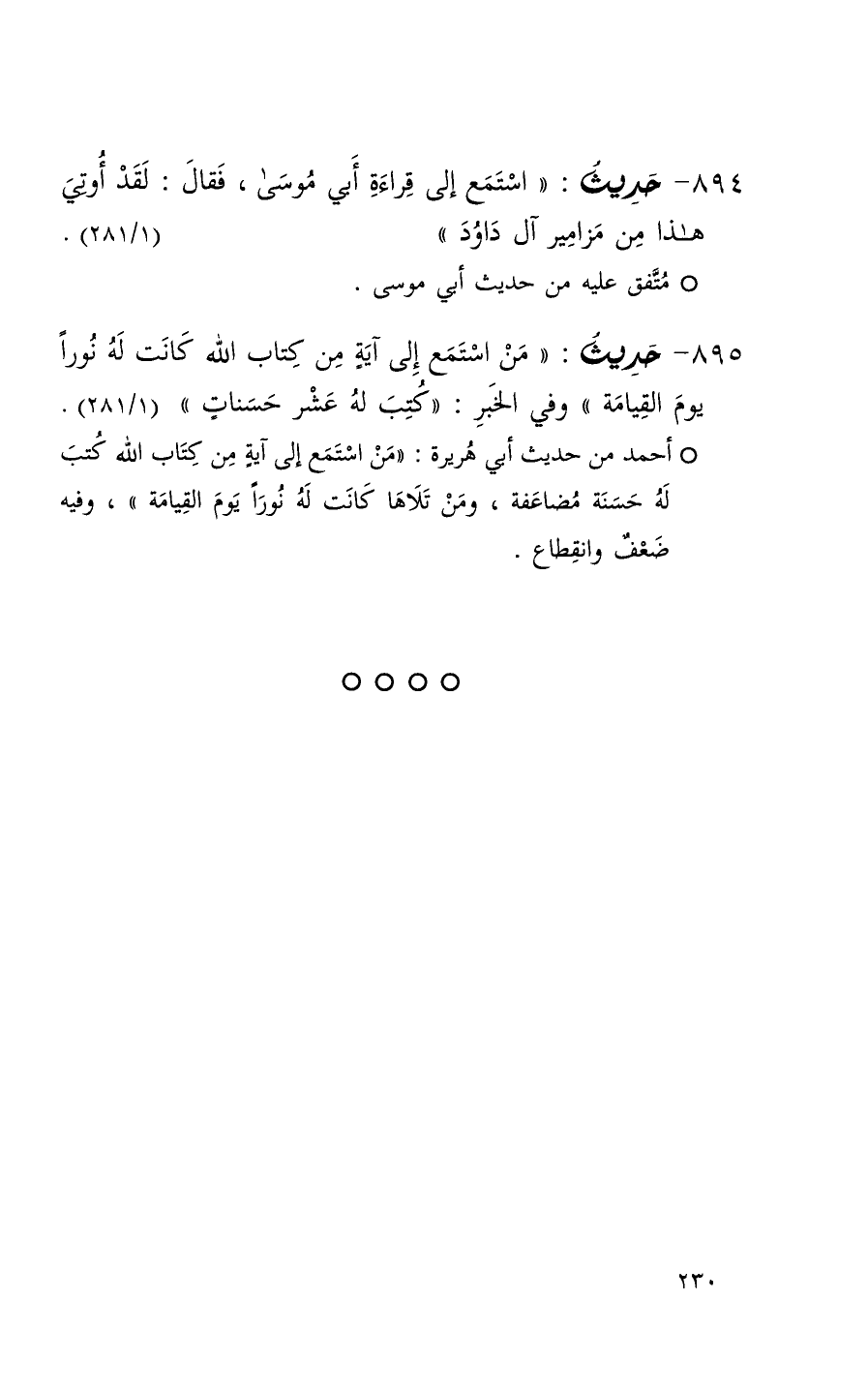 894 حديث ( استمع إلى قراءة أبي موسى فقال لقد أوتي هذا من مزامير آل داود ) ( 1 / 281 ) (1)