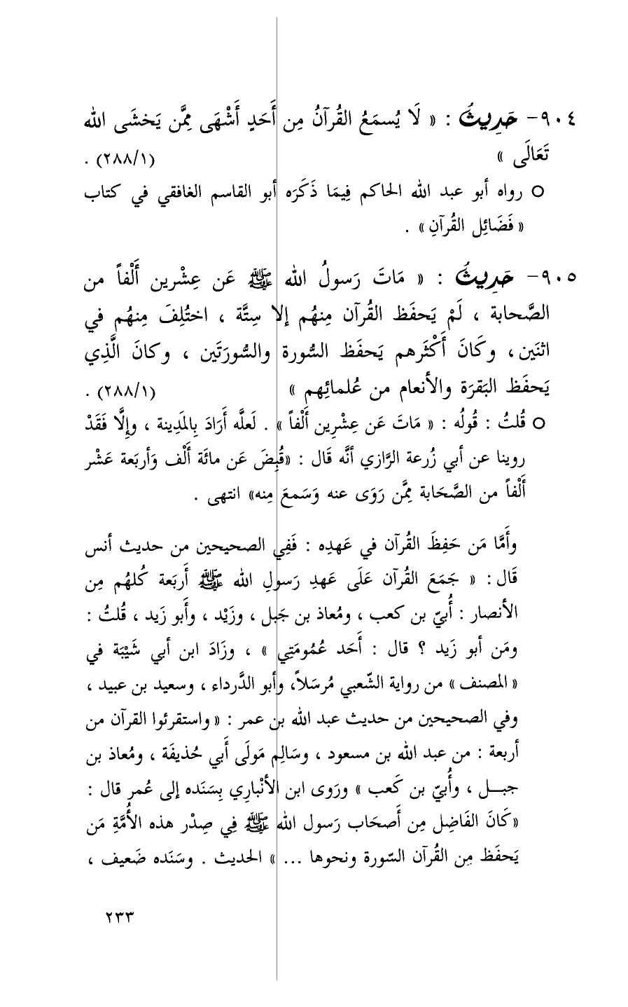 905 حديث ( مات رسول الله عن عشرين ألفاً من الصحابة لم يحفظ القرآن منهم إلا ستة أختلف منهم في اثنين وكان أكثرهم يحفظ السورة والسورتين وكان الذي يحفظ البقرة والأنعام من علمائهم ) ( 1 / 288 ) + قلت قوله مات عن عشرين ألفاً لعله أراد بالمدينة وإلا فقد روينا عن أبي زرعة الرازي أنه قال قبض عن مائة ألف وأربعة عشر ألفاً من الصحابة ممن روى عنه وسمع منه انتهى وأما من حفظ القرآن في عهده ففي الصحيحين من حديث أنس قال جمع القرآن على عهد رسول الله أربعة كلهم من الأنصار أبي بن كعب ومعاذ بن جبل وزيد وأبو زيد قلت ومن أبو زيد قال أحد عمومتي وزاد ابن أبي شيبة في المصنف من رواية الشعبي مرسلاً وأبو الدرداء وسعيد بن عبيد وفي الصحيحن من حديث عبد الله بن عمر واستقرئوا القرآن من أربعة من عبد الله بن مسعود وسالم مولى أبي حذيفة ومعاذ بن جبل وأبي بن كعب ) وروى ابن الأنباري بسنده إلى عمر قال ( كان الفاضل من أصحاب رسول الله في صدر هذه الأمة من يحفظ من القرآن السورة ونحوها 000 ) الحديث وسنده ضعيف