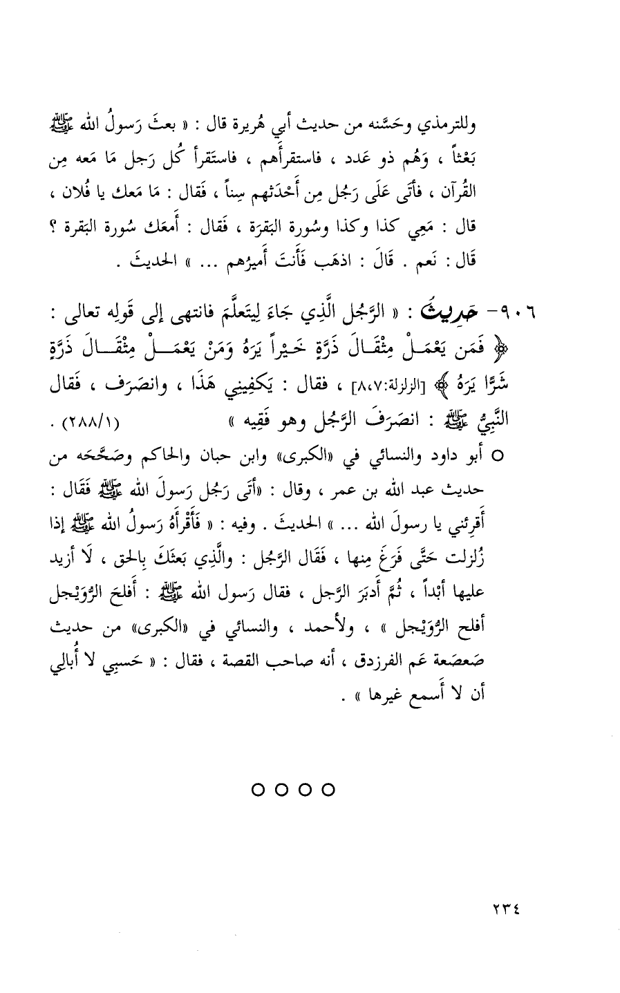906 حديث ( الرجل الذي جاء ليتعلم فانتهى إلى قوله تعالى ( ^ فمن يعمل مثقال ذرة خيراً يره ومن يعمل مثقال ذرة شراً يره ) الزلزلة 7 / 8 فقال يكفيني هذا وانصرف فقال النبي انصرف الرجل وهو فقيه ) ( 1 / 288 )