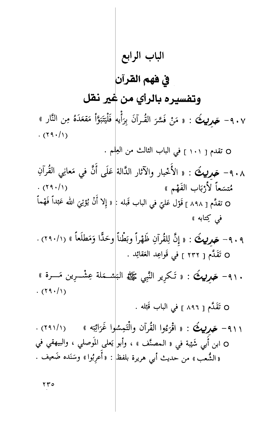 907 حديث ( من فسر القرآن برأيه فليتبوأ مقعده من النار ) ( 1 / 290 ) (1)