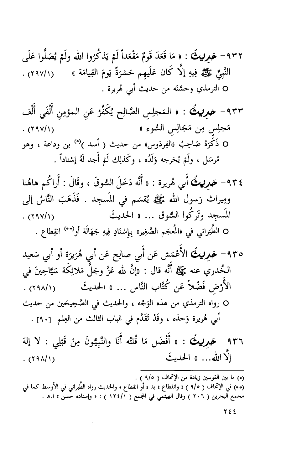 932 حديث ( ما قعد قوم مقعداً لم يذكروا الله ولم يصلوا على النبي فيه إلا كان عليهم حسرة يوم القيامة ) ( 1 / 297 ) (1)