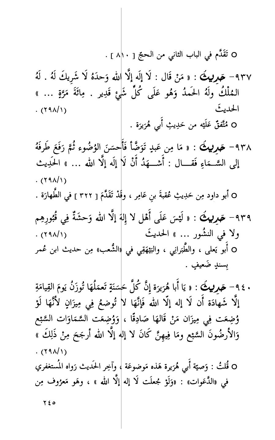 937 حديث ( من قال لا إله إلا الله وحده لا شريك له له الملك وله الحمد وهو عل كل شيء قدير مائة مرة 000 ) الحديث ( 1 / 298 ) + متفق عليه من حديث أبي هريرة +