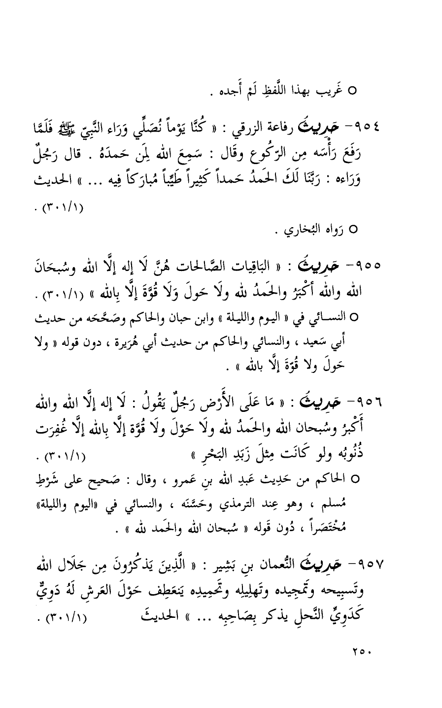 957 حديث النعمان بن بشير ( الذين يذكرون من جلال الله وتسبيحه وتمجيده وتهليله وتحميده ينعطف حول العرش له دوي كدوي النحل يذكر بصاحبه 000 ) الحديث ( 1 / 301 )