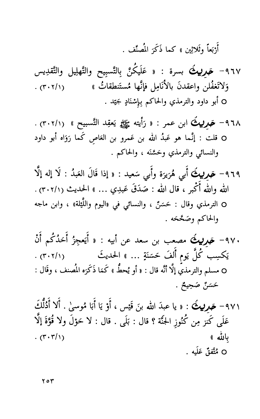 967 حديث بسرة ( عليكن بالتسبيح والتهليل والتقديس ولا تغفلن واعقدن بالأنامل فإنها مستنطقات ) ( 1 / 302 )