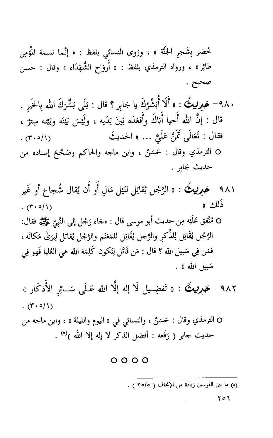 980 حديث ( ألا أبشرك يا جابر قال بلى بشرك الله بالخير قال إن الله أحيا أباك وأقعده بين يديه وليس بينه وبينه ستر فقال تعالى تمن علي 00 ) الحديث ( 1 / 305 )