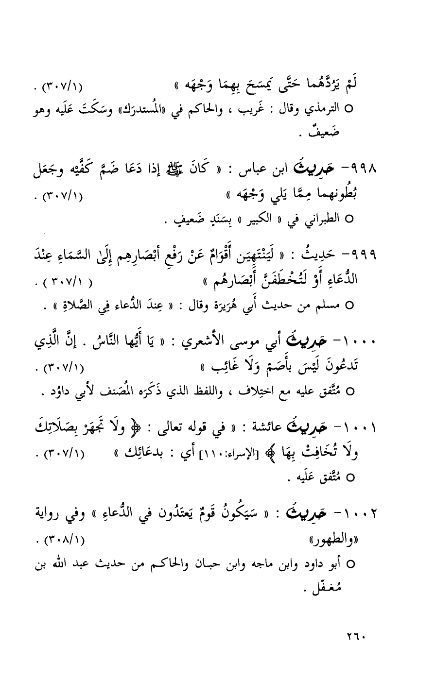 999 حديث ( لينتهين أقوام عن رفع أبصارهم إلى السماء عند الدعاء أو لتخطفن أبصارهم ) ( 1 / 307 ) + مسلم من حديث أبي هريرة وقال ( عند الدعاء في الصلاة ) +
