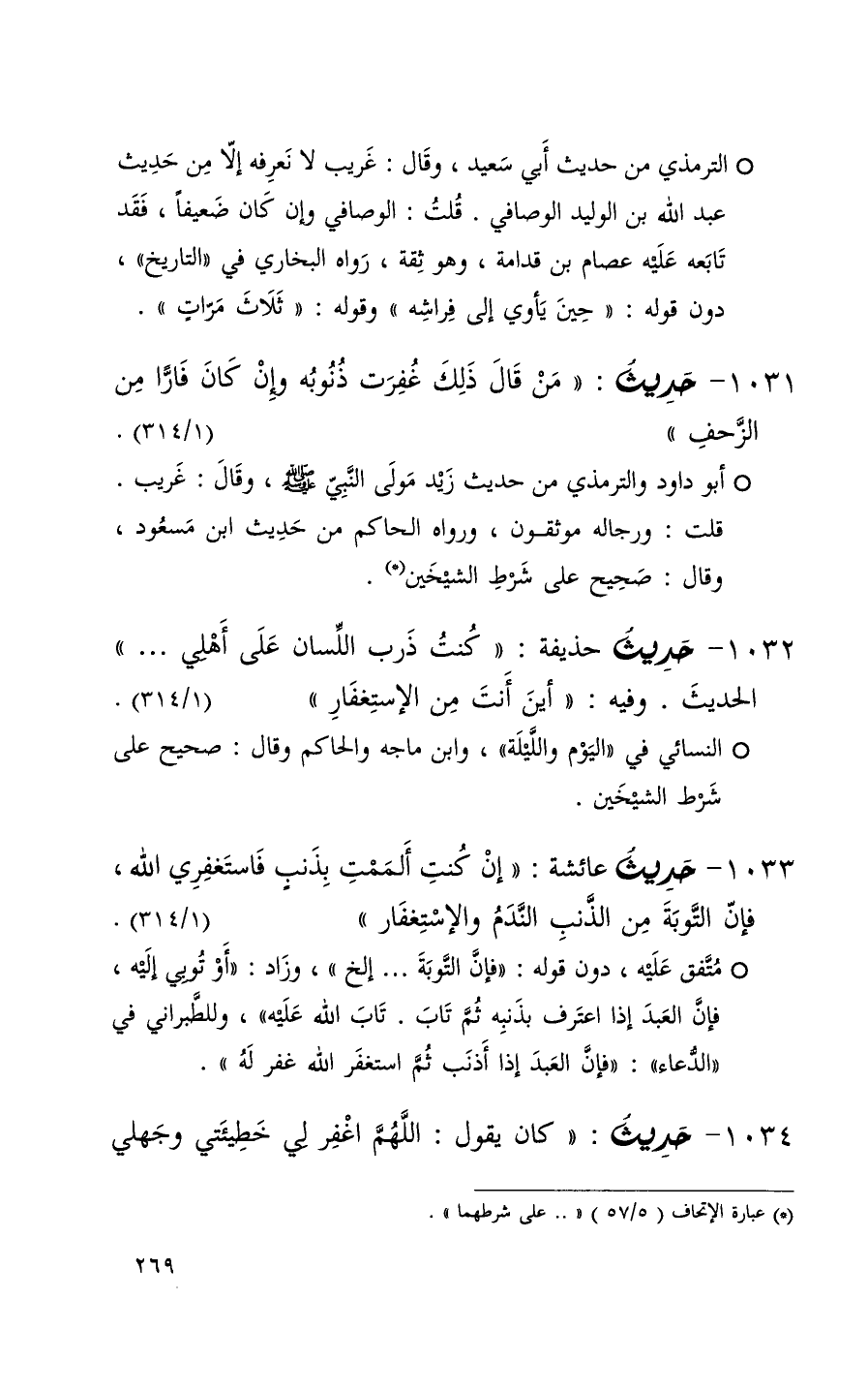 1033 حديث عائشة ( إن كنت ألممت بذنب فاستغفري الله فإن التوبة من الذنب الندم والاستغفار ) ( 1 / 314 ) + متفق عليه دون قوله ( فإن التوبة . . . إلخ ) وزاد ( أو توبي إليه فإن العبد إذا اعترف بذنبه ثم تاب تاب الله عليه ) وللطبراني في الدعاء ( فإن العبد إذا أذنب ثم استغفر الله غفر له ) +