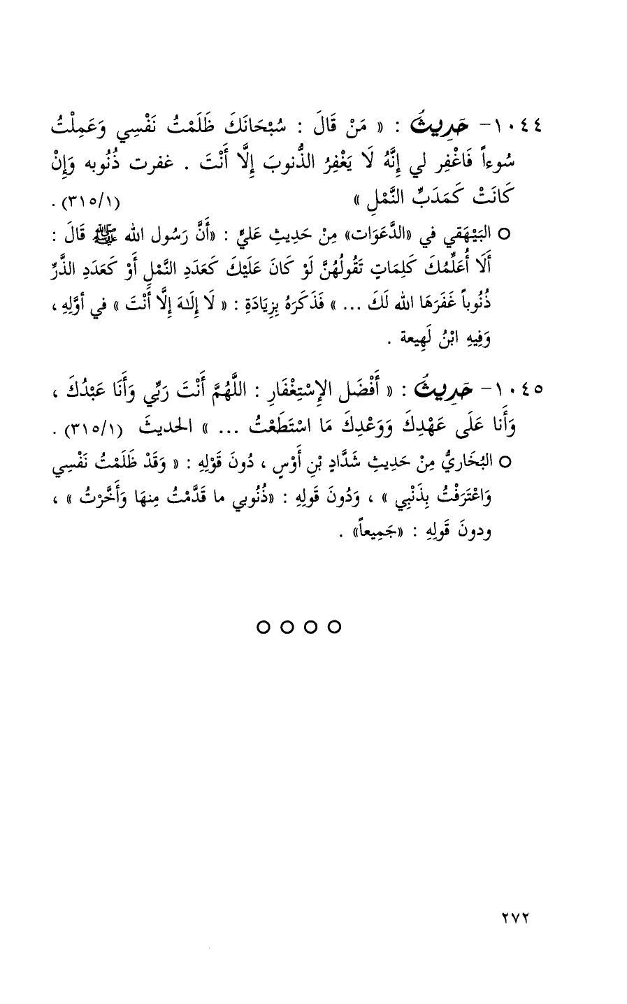 1044 حديث ( من قال سبحانك ظلمت نفسي وعملت سواءاً فاغفر لي إنه لا يغفر الذنوب إلا أنت غفرت ذنوبه وإن كانت كمدب النمل ) ( 1 / 315 ) (1)