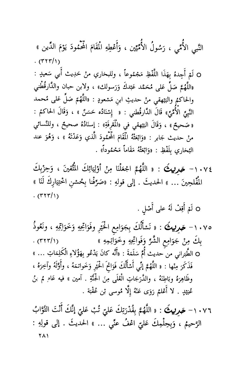 1074 حديث ( اللهم اجعلنا من أوليائك المتقين وحزبك المفلحين . . . ) الحديث إلى قوله ( صرفنا بحسن اختيارك لنا ) ( 1 / 323 ) + + لم أقف له على أصل +