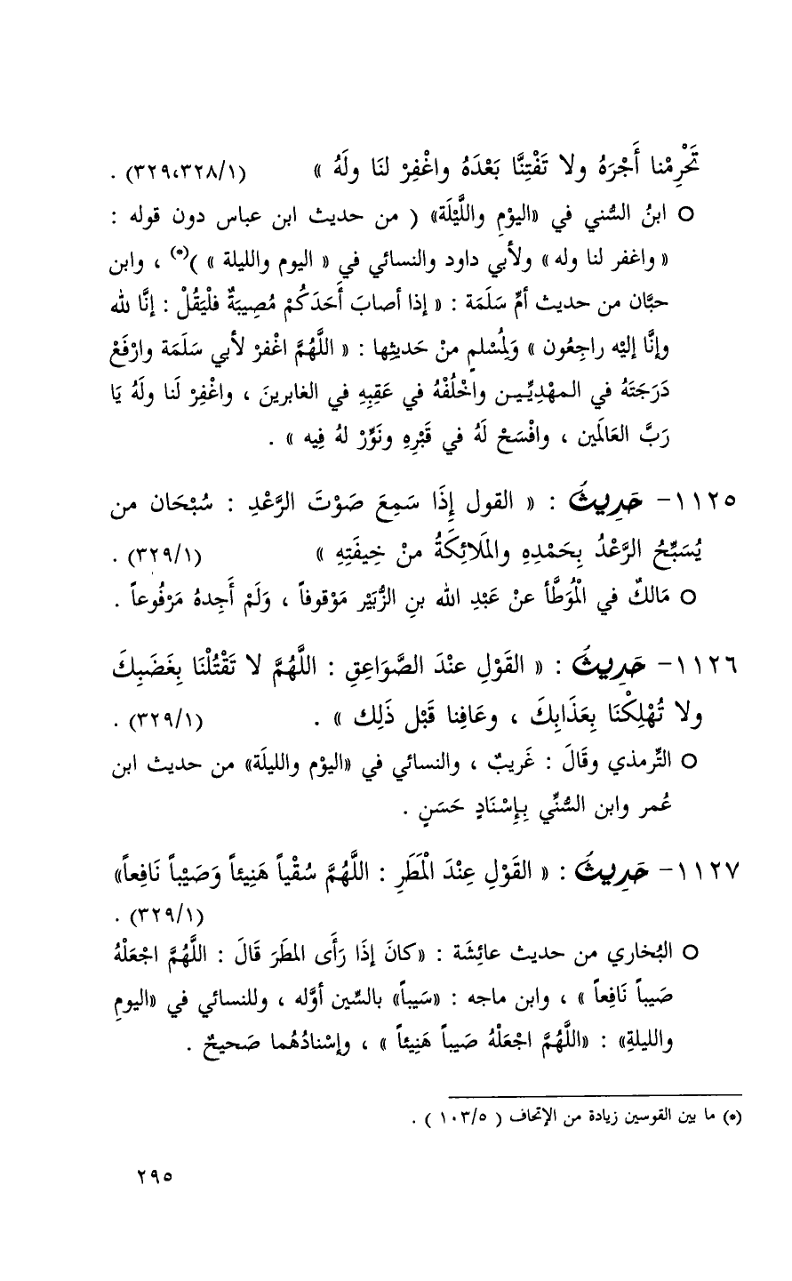 1125 حديث ( القول إذا سمع صوت الرعد سبحان من يسبح الرعد بحمده والملائكة من خيفته ) ( 1 / 329 ) + مالك في الموطأ عن عبد الله بن الزبير موقوفاً ولم أجده مرفوعاً +